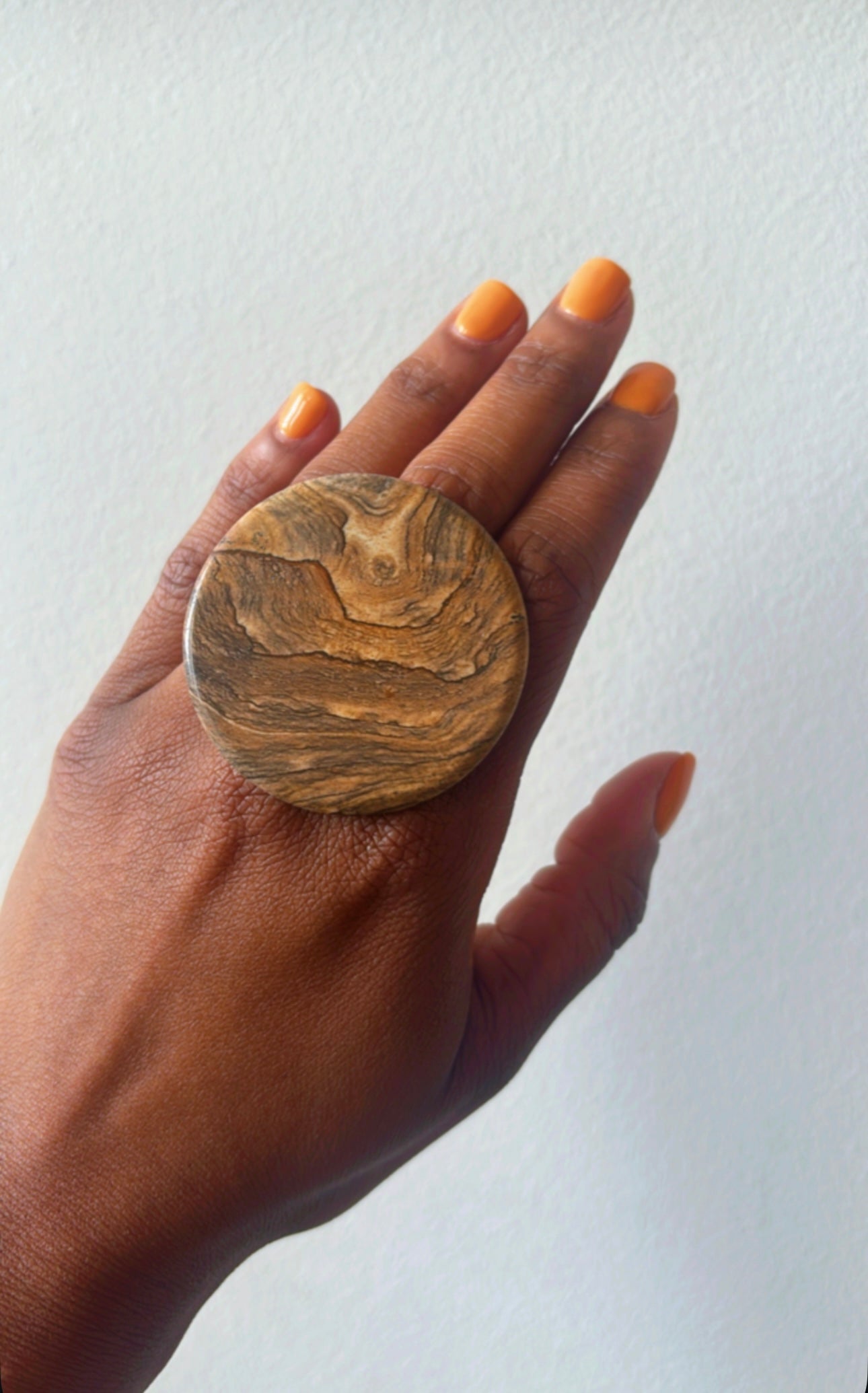 a tan round stone on a 20mm gold brass adjustable setting.