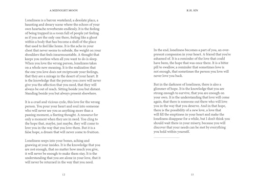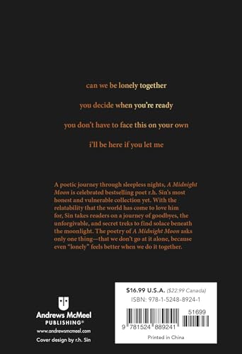 A Midnight Moon is a moving collection of poetry from celebrated bestselling author r.h. Sin. With the honesty and transparency that he has become known for, Sin takes readers on a journey of goodbyes, the unforgivable, and secret treks to find solace beneath the moon. A poetic journey through sleepless nights, A Midnight Moon is r.h. Sinβs best work yet.