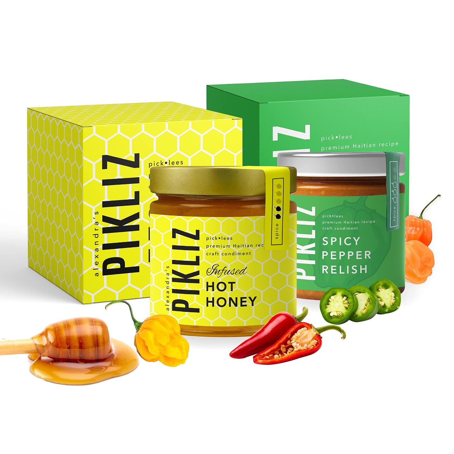 Alexandra's Pikliz: Variety Pack - West Indian & Haitian Inspired, Caribbean Flavors - Spicy Pepper Relish 7.5oz & Infused Hot Honey 9.0oz (Pack of 2)