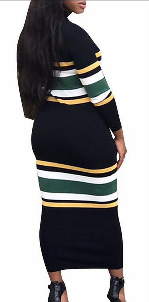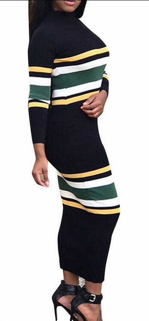 Alion Women's Stand-collar Stripe Color Block Long-sleeves Dress Black M