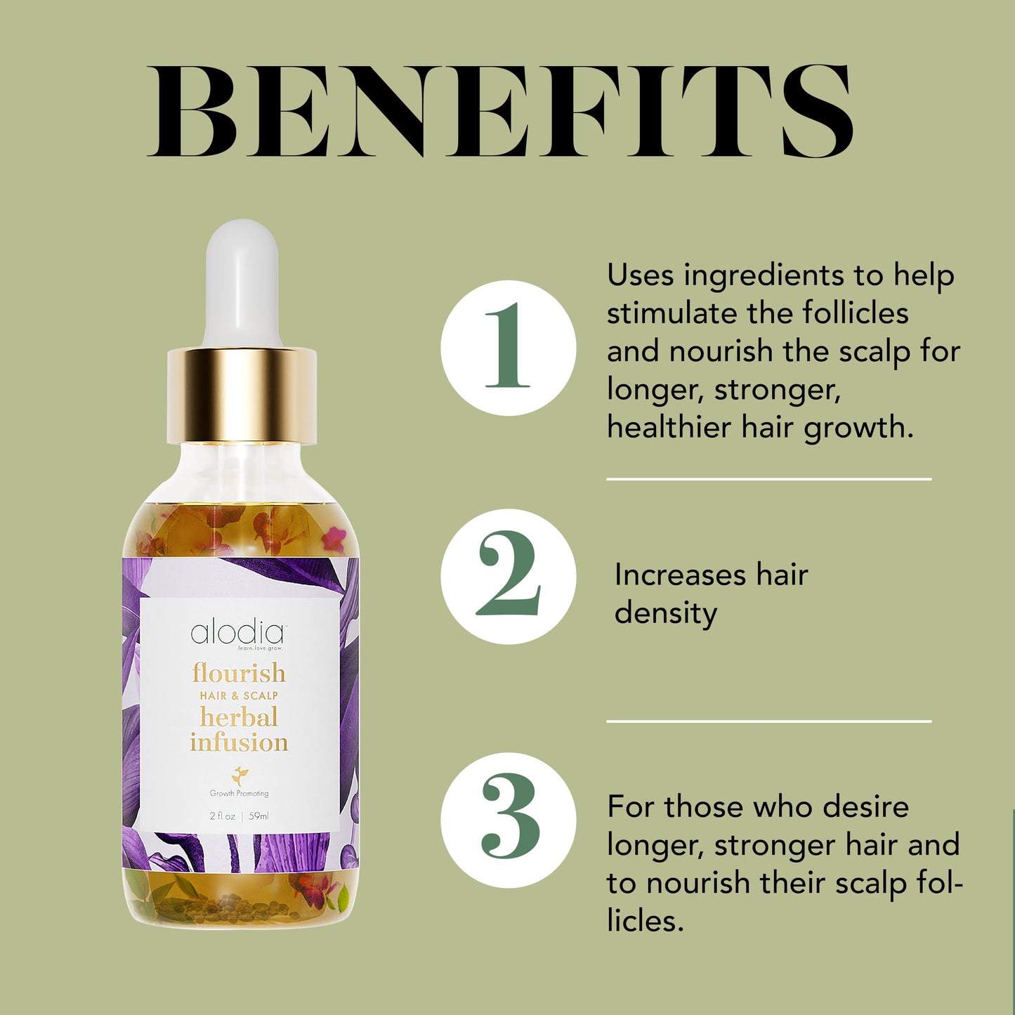 Details: "Introducing Alodia FLOURISH Hair & Scalp Herbal Infusion Oil - the ultimate solution for longer, stronger, and healthier hair! Our nutrient-rich, all-natural formula combats hair thinning caused by traction alopecia or genetic factors. Powered by essential oils, it stimulates hair growth and nourishes the scalp, resulting in enhanced length and strength. Designed for all - women, men, and children with normal scalps - our hair growth oil is a perfect blend of safflower oil and Saw Palmetto berries. Experience hair elasticity with essential fatty acid-rich safflower oil, while Saw Palmetto supports inhibiting DHT production for optimal hair growth. Enjoy luscious, soft, and nourished locks, thanks to our all-natural ingredients! With easy directions, this 2-ounce herbal infusion oil is your hair's best friend. Just apply 1-2 drops to each partition, massage into the scalp, and leave it in - no rinsing required! Use 4-8 drops for full scalp coverage, and enjoy its benefits post-wash and pre-styling. Expect a delightful tingling sensation, a sign of its efficacy. Embrace clean green beauty with Alodia FLOURISH, made entirely with all-natural ingredients, free from harmful chemicals. Experience the power of Alodia's Naturally Developed Scalp Science, an innovative and scientifically proven hair solution system, promoting natural hair growth. Trust Alodia for healthier, more beautiful tresses!"