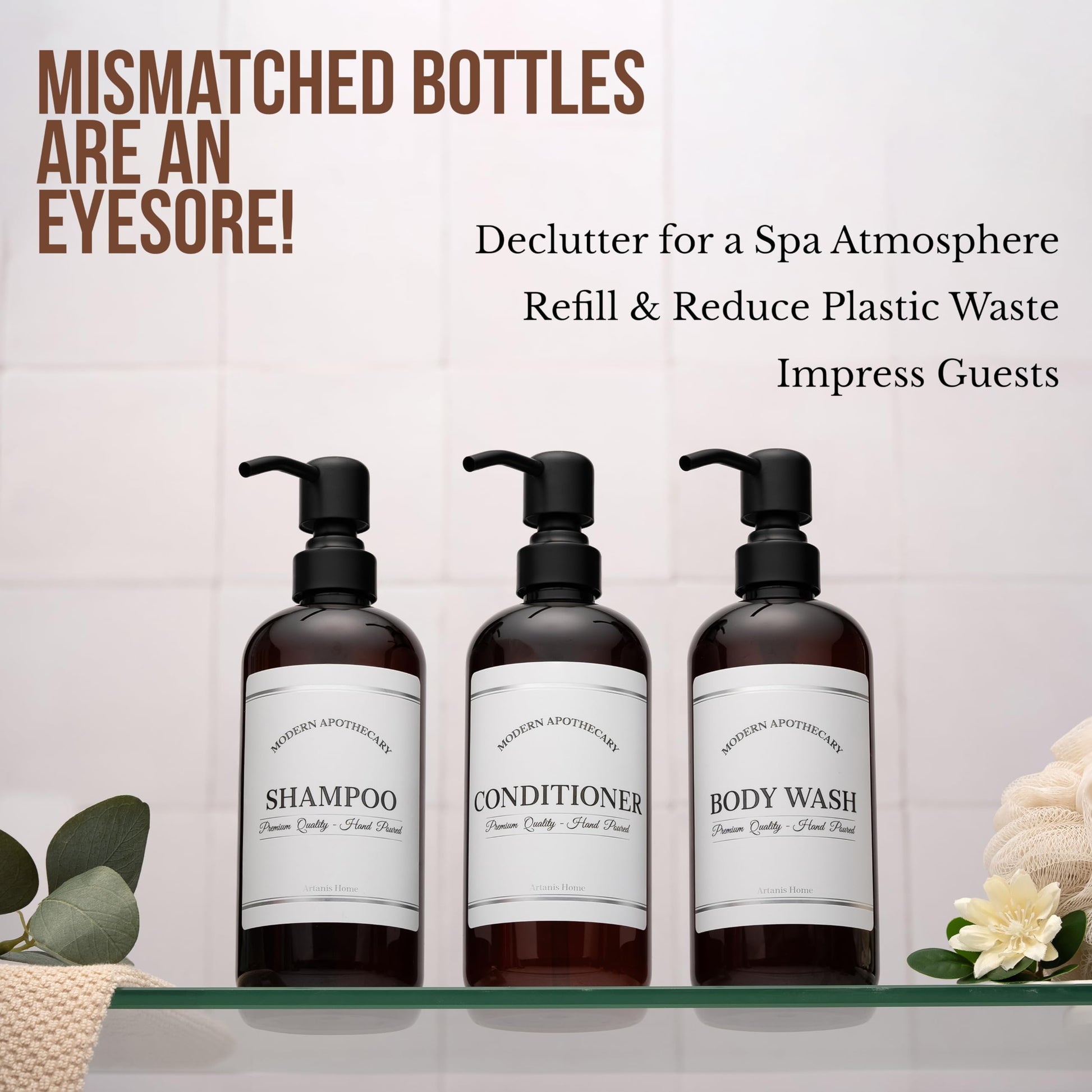 - Bring Style To Your Bathroom: Revel in the luxury of a well-organized shower. Refine your interior decor with these chic body wash, conditioner and shampoo dispenser bottles. Curate your whole home. Modern Apothecary bathroom bottles coordinate with additional matching titles for the sink, kitchen, office, and rentals. Classy, with a touch of retro flair
