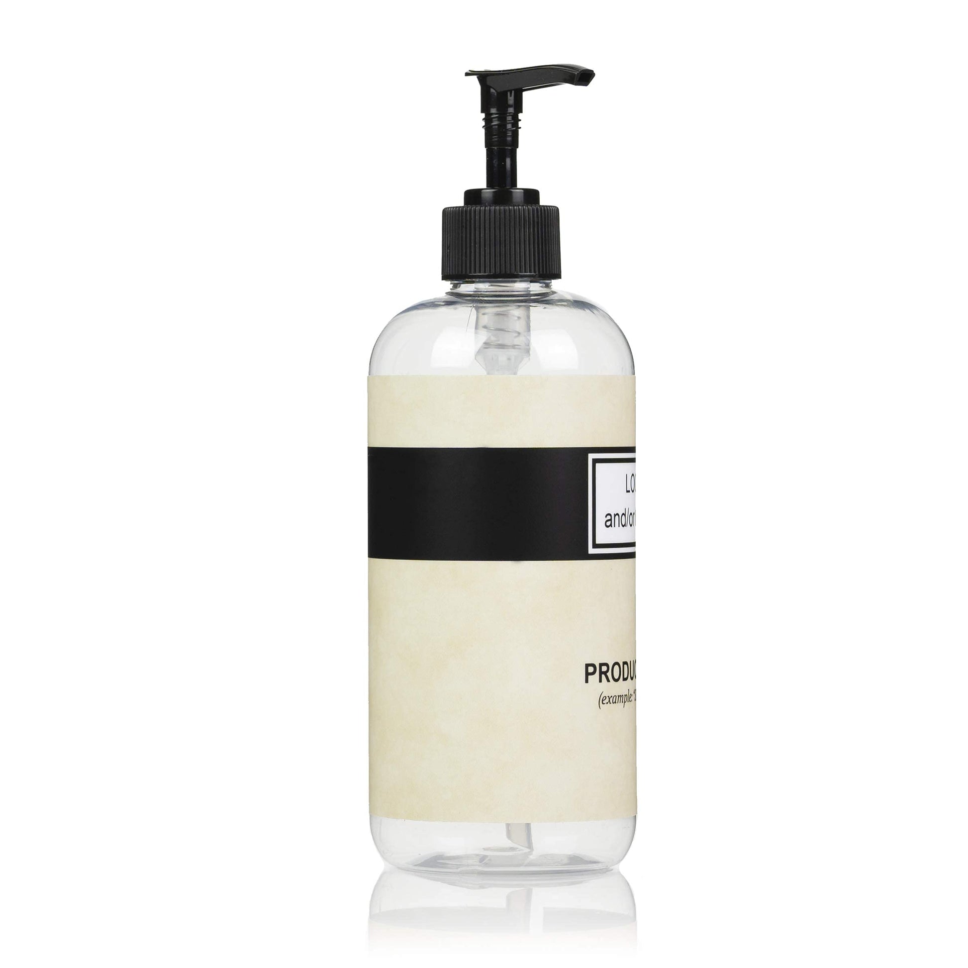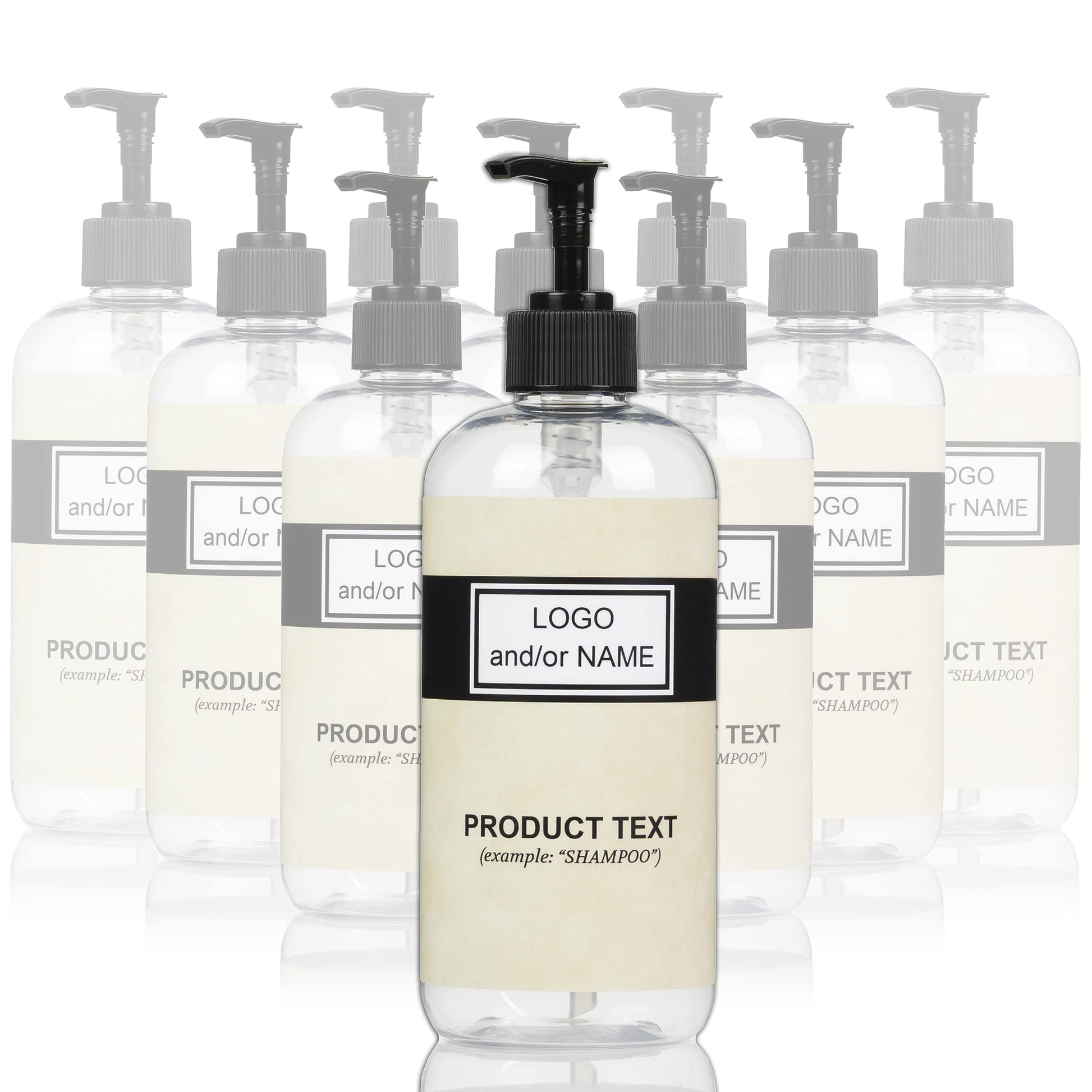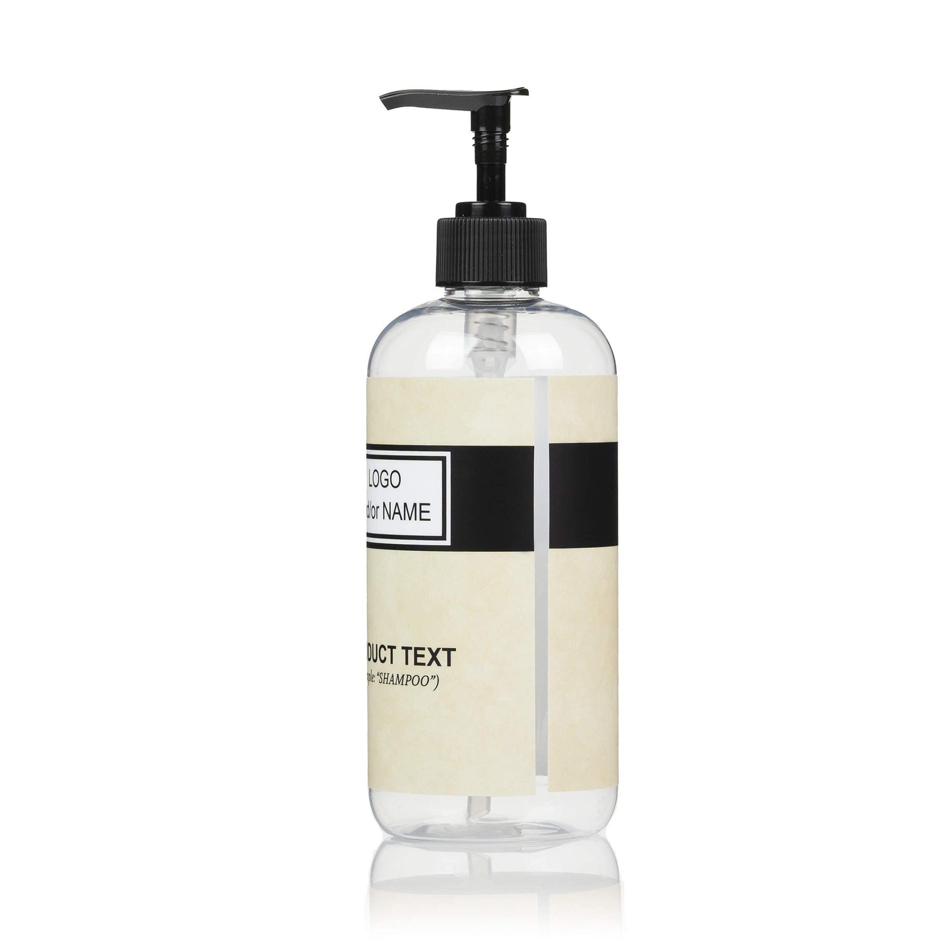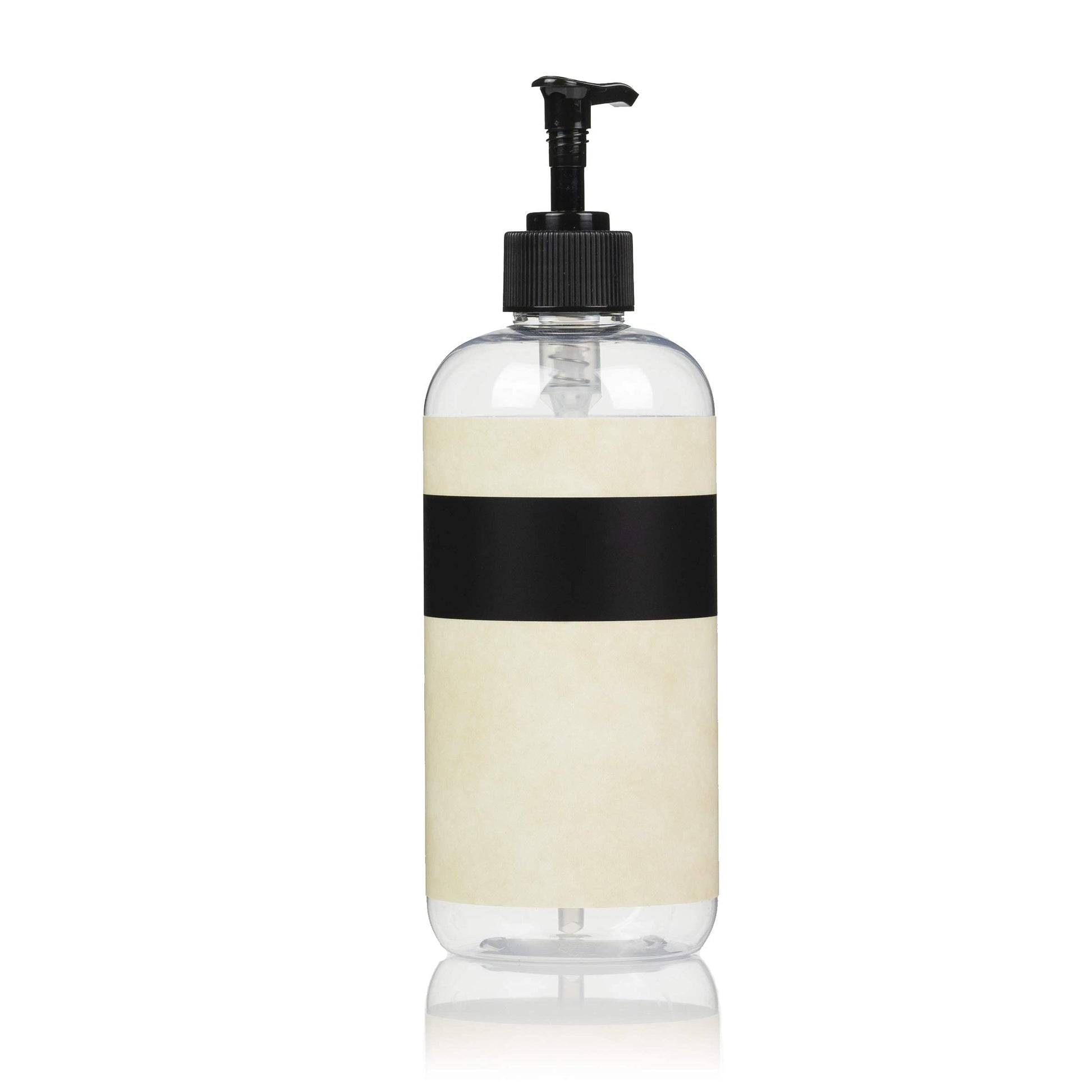 Artanis Home 10-Pack Customized PET Plastic Refillable Pump Bottles with Black and Tan Design Waterproof Labels and Black Pumps, Clear