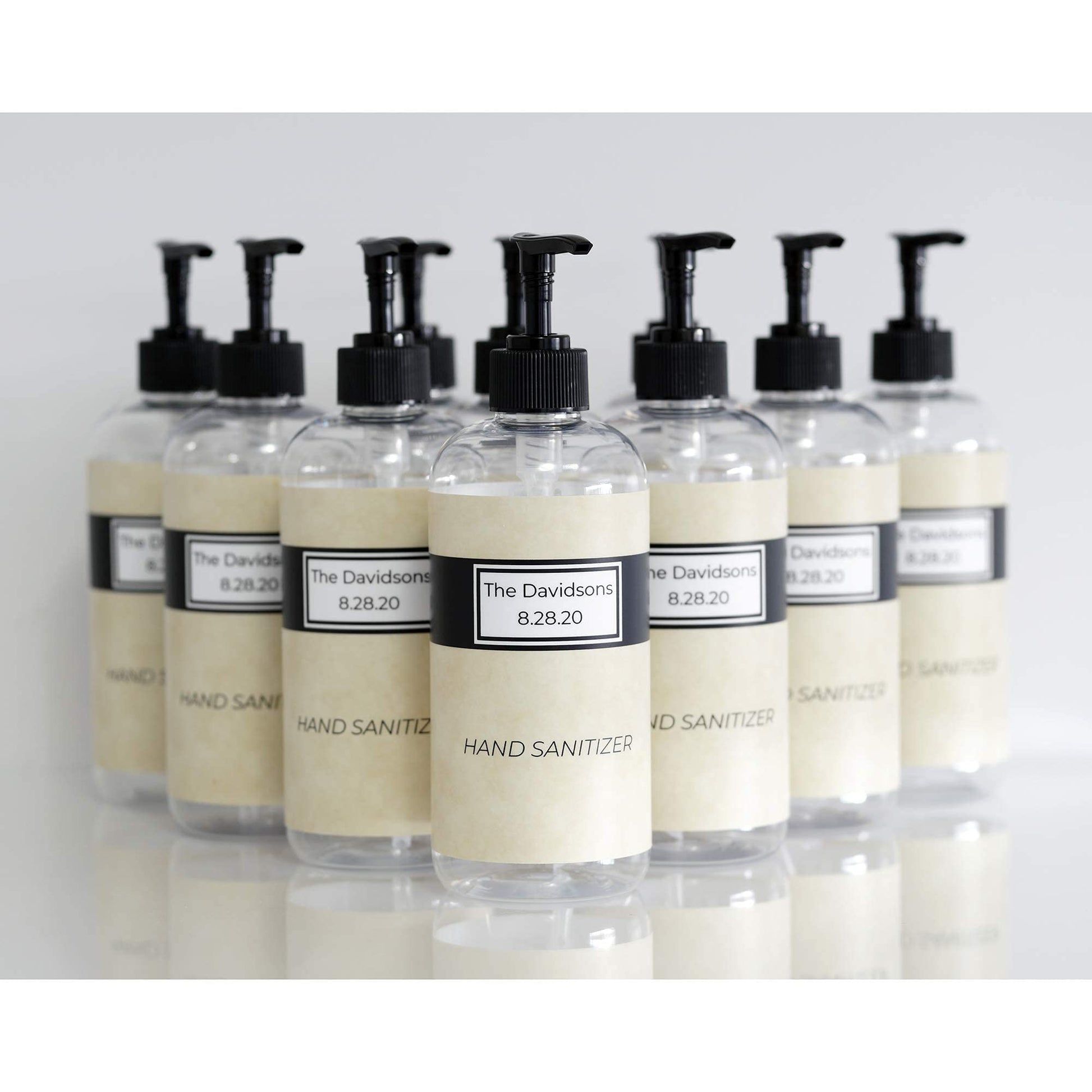 Details: Modern and neutral customized set of 16 oz bottles good for amenities or hand sanitizer comes in sets of 10. We've created these designs to meet many decor needs and currently have 3 predesigned styles. This listing features our "Black and Tan" design. The ample-sized bottles are 8 1/8" tall and 2 3/4" in diameter. Please note that the 10 labels must have the same customization. For multiple, like Shampoo, Conditioner, and Body Wash, you must order 3 sets for 30 bottles. Please customize using the features Amazon provides and contact us with any questions, changes, or concerns. If you're getting more than one design, be sure to design one fully, and on subsequent designs leave everything blank that won't need to change and include a note in the "Additional Information/Special Requests" field. (This is to give us one design to go from, and you won't need to fully flesh out the exact same design multiple times.) We will send you a preview of your design for approval before going to print. Please be aware if you have opted out of Amazon e-mails. If we cannot contact you, we will do our best to design according to what you've given us. We MAY correct grammatical errors, capitalization inconsistencies and misspellings if we see them.