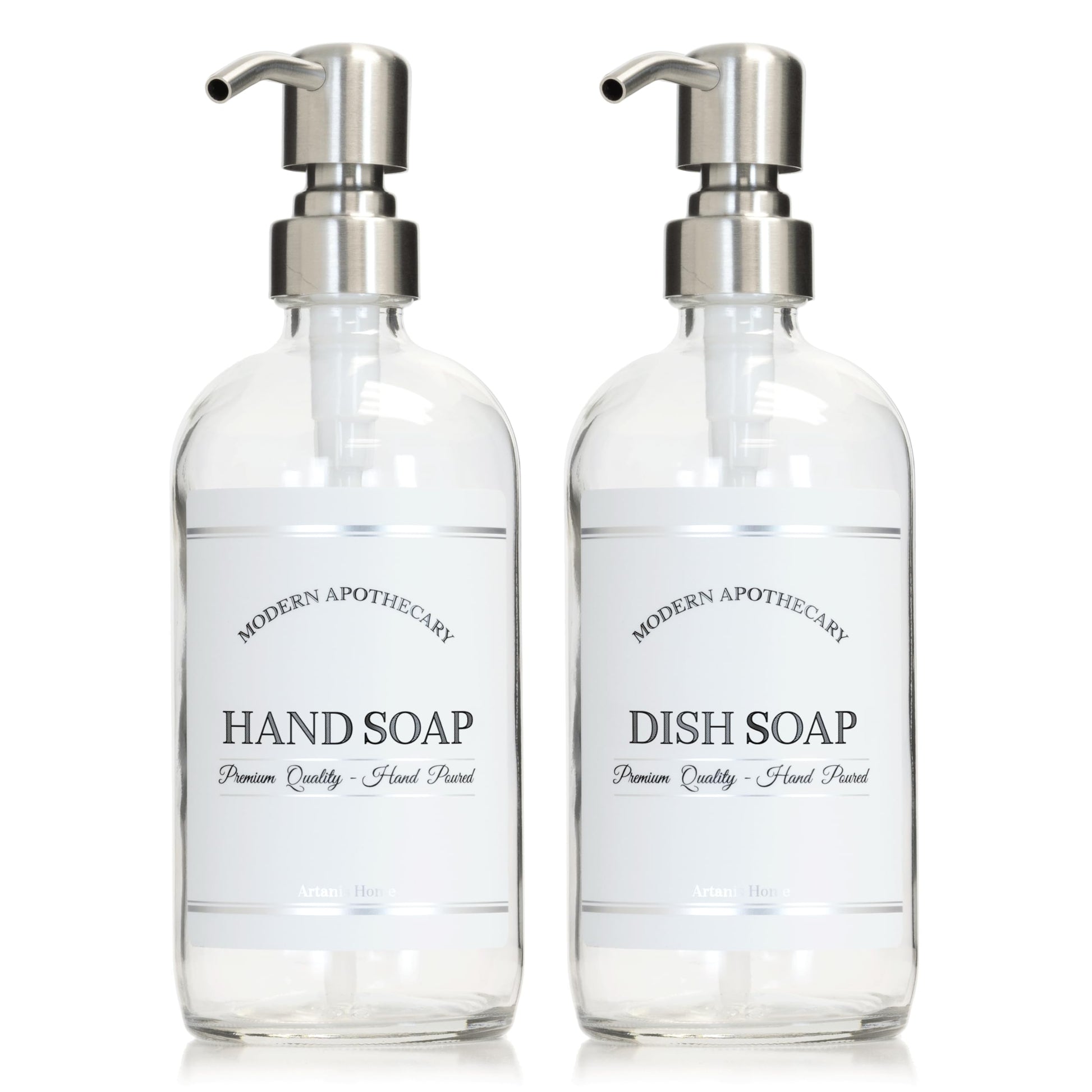 Artanis Home Clear Refillable Hand and Dish Soap Dispenser Set with Pumps for Kitchen Sink - Glass Boston Round Soap Bottles - Waterproof Labels - 16 oz - 2 Pack