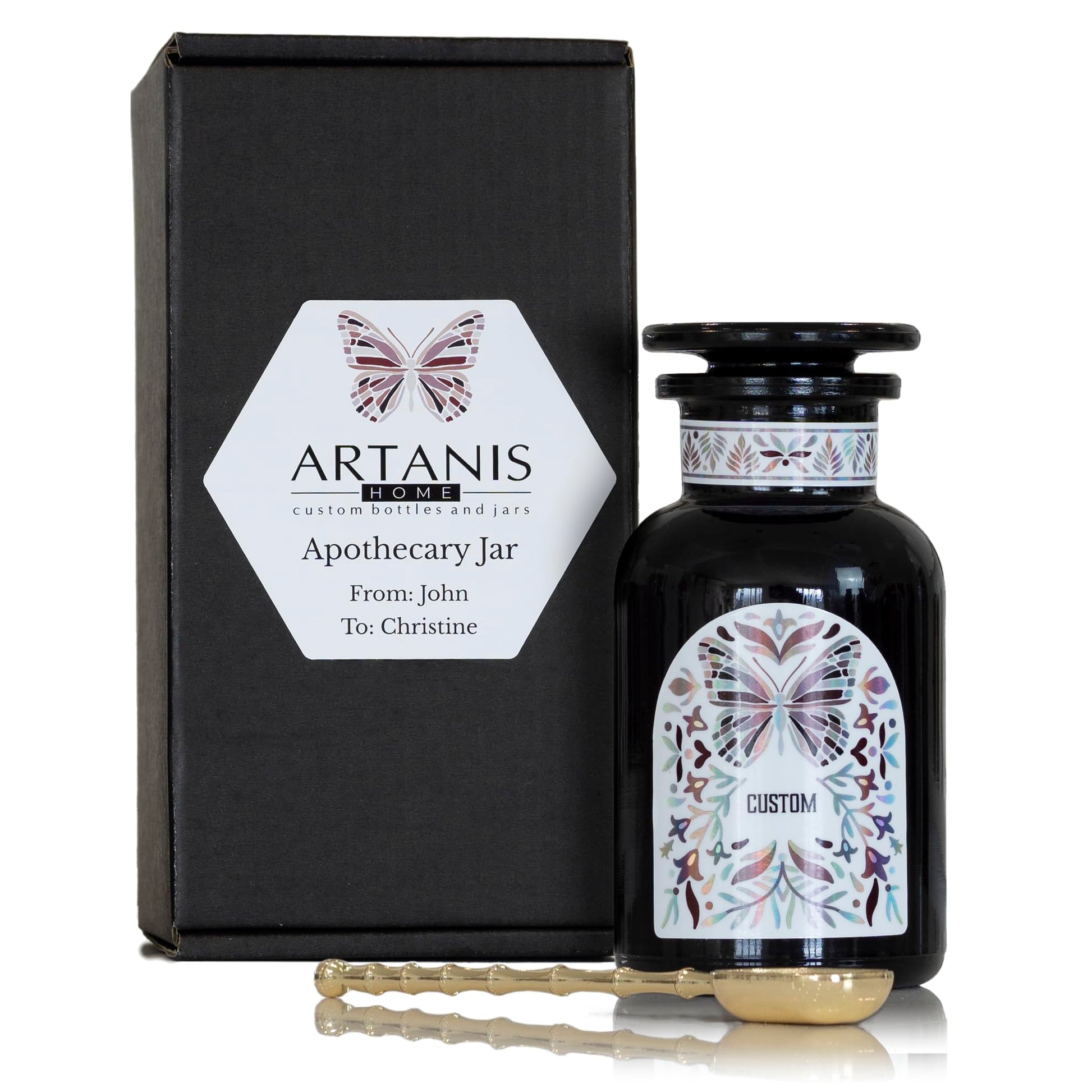 Artanis Home Custom Ultraviolet Glass Apothecary Jar, Gift for Tea Lovers, Airtight Glass Storage for Tea, Herbs, and Spices, with Lid, Custom Gift Box, and Spoon for Home Apothecary, 250 ml