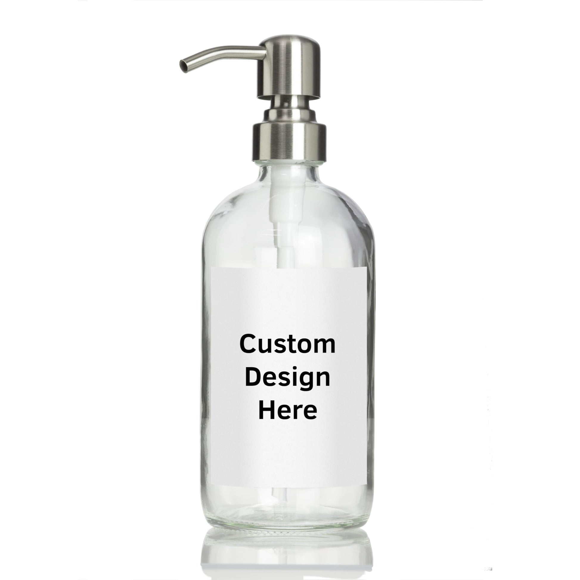 Artanis Home Customized Refillable Clear Glass Soap Dispenser Bottle, Personalized Label for Hand Soap, Dish Soap, Shampoo, etc., Pump Dispensers for Vacation Properties and Homes, Stainless Steel