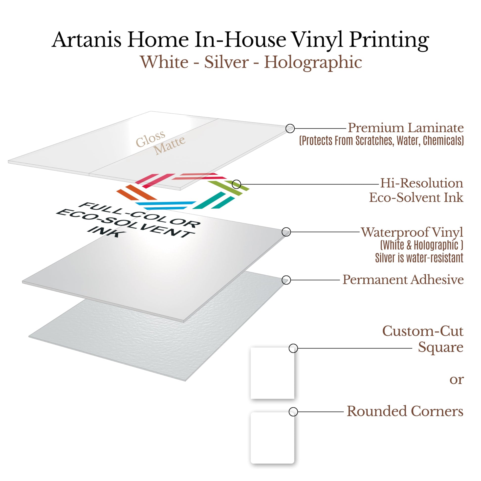 - Premium Vinyl Labels: We use white, silver, and holographic vinyl and high-resolution print. Hand laminated with matte or gloss waterproof plastic laminate and precision-cut. Labels are 3.25 inches wide by 3.75 inches high.