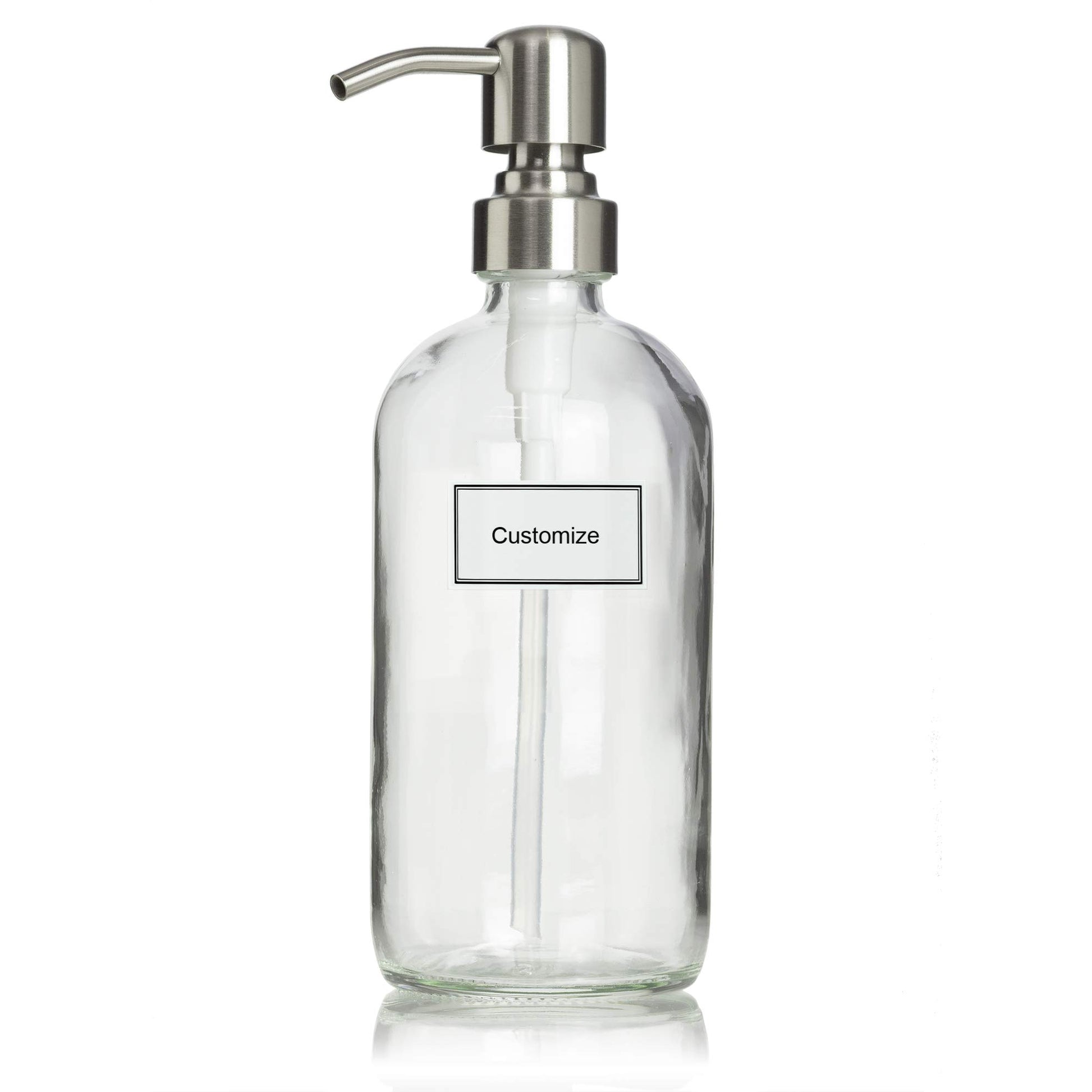 Artanis Home Glass Bottle Including Stainless Steel Pump and Customized Waterproof Label, 16 oz Boston Round, Clear