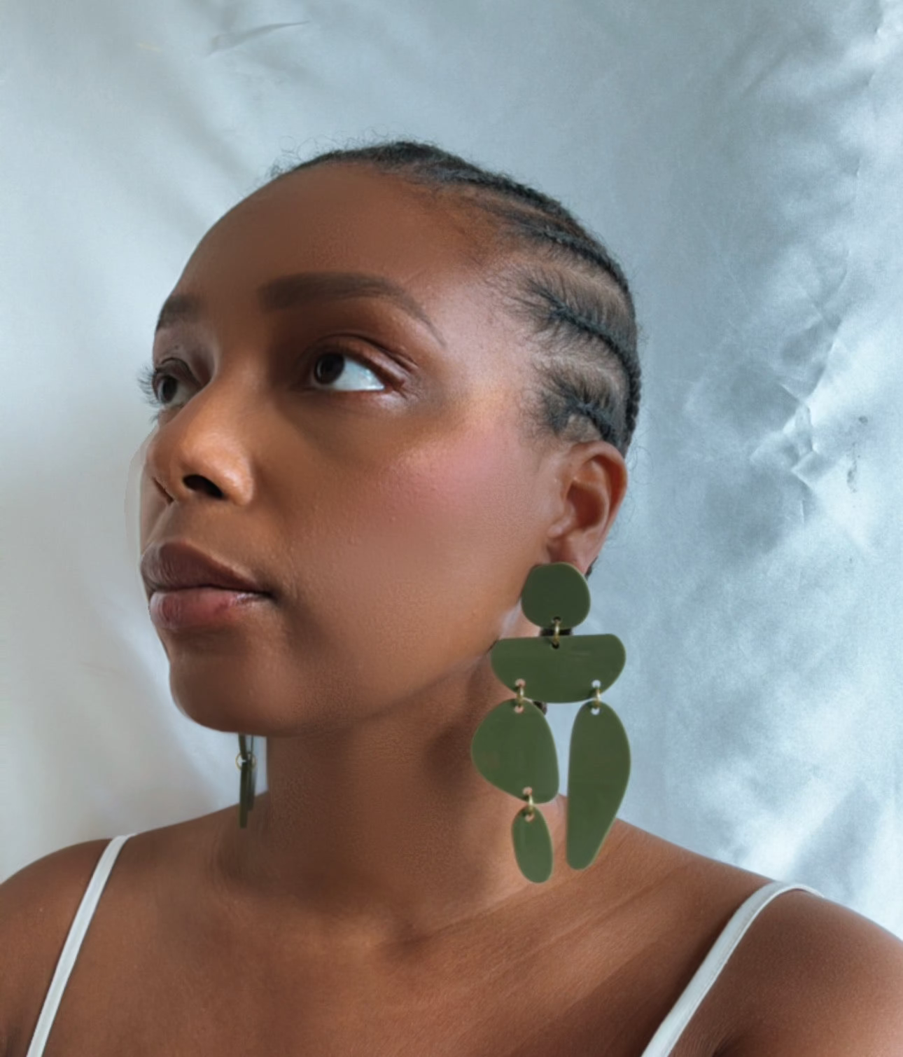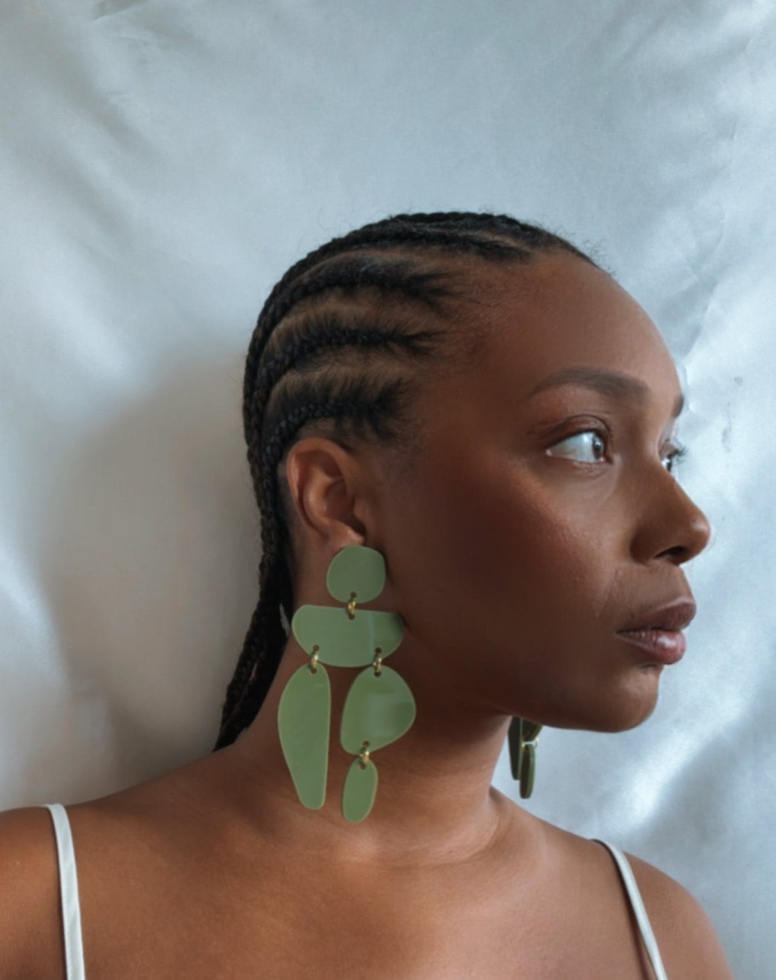 a hunter green linked earring with gold hardware. approximately 4 inches long.