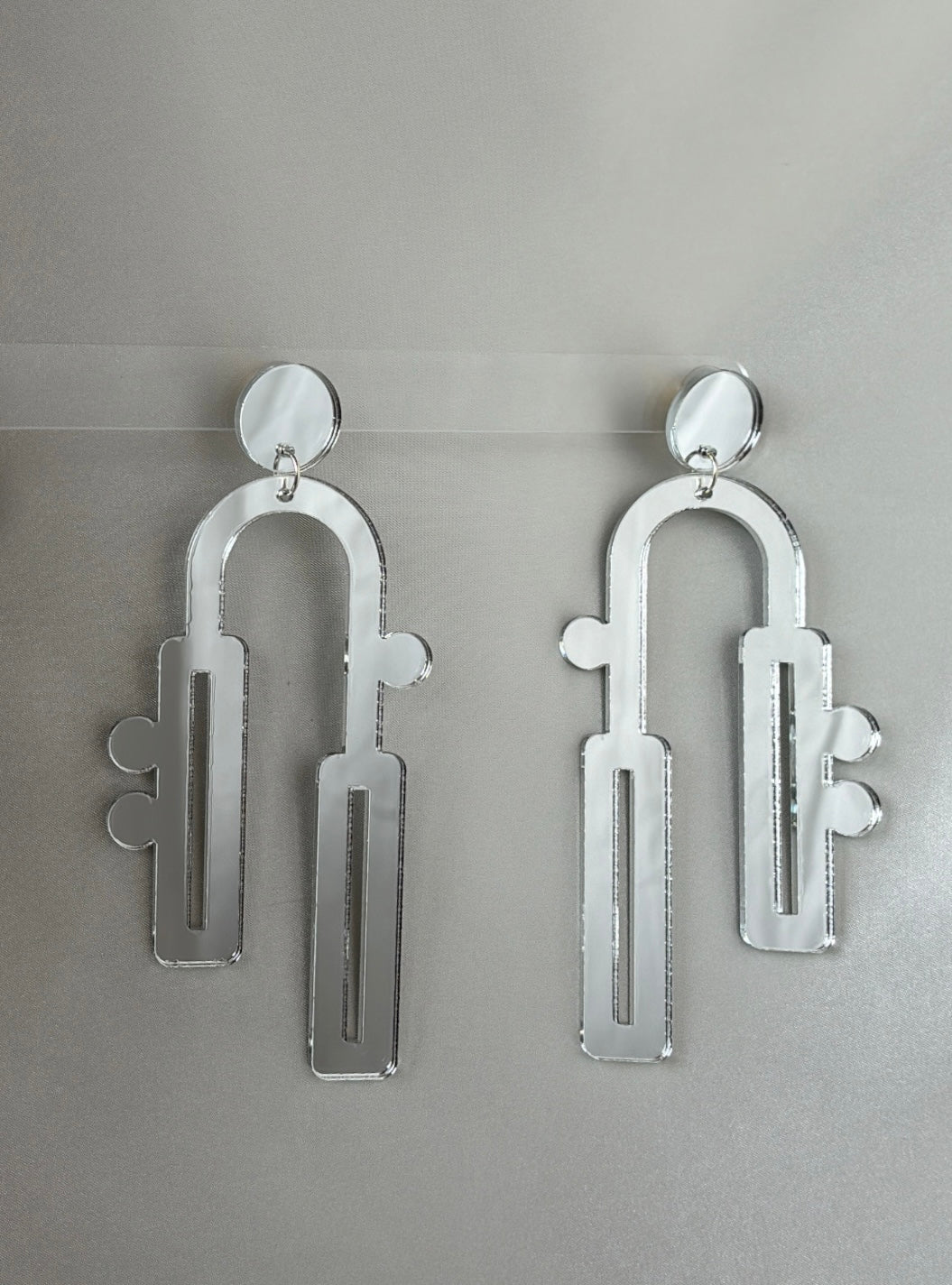 an arch shaped mirror acrylic earring. approximately 5 inches in length.