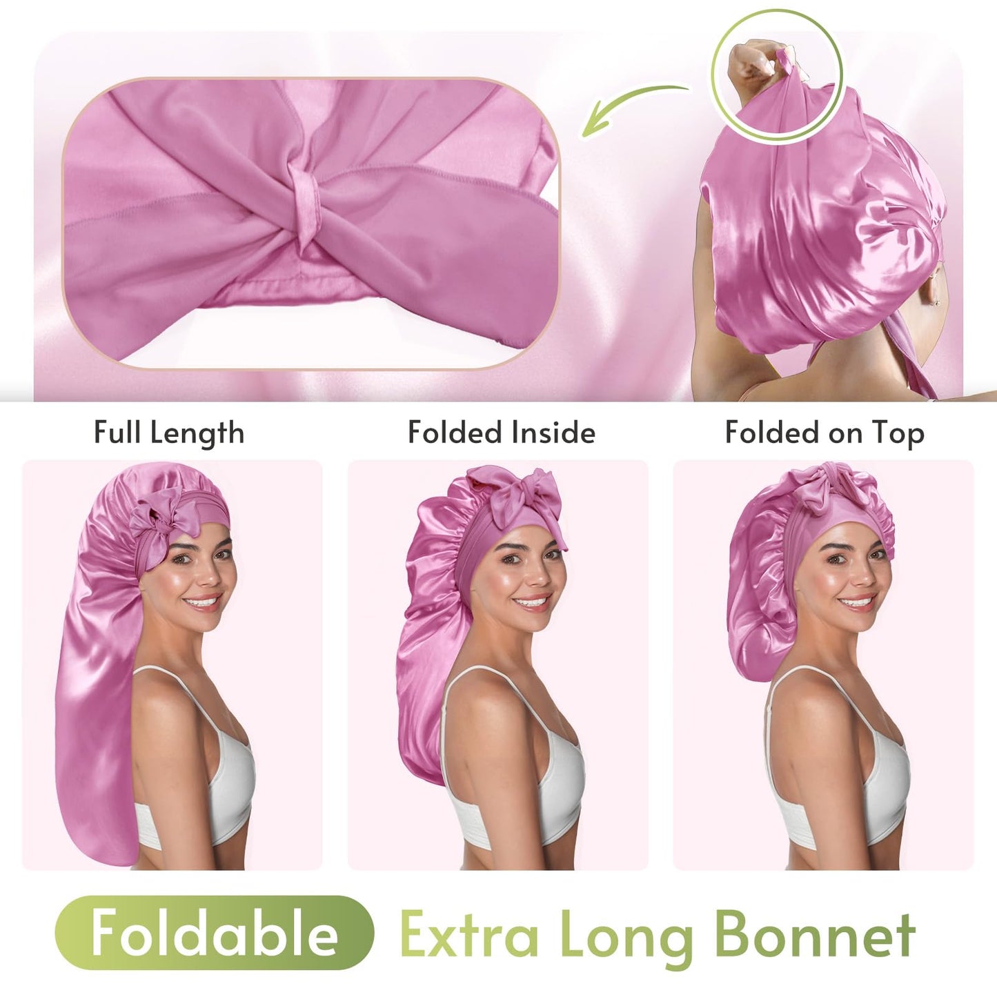 - Foldable Design and Extra Long Adjustable: Features an extra-long design with a satin loop at the end and adjustable elastic, which can be threaded with long elastic and tied in a knot on the forehead adjust the length of the long hair bonnet.