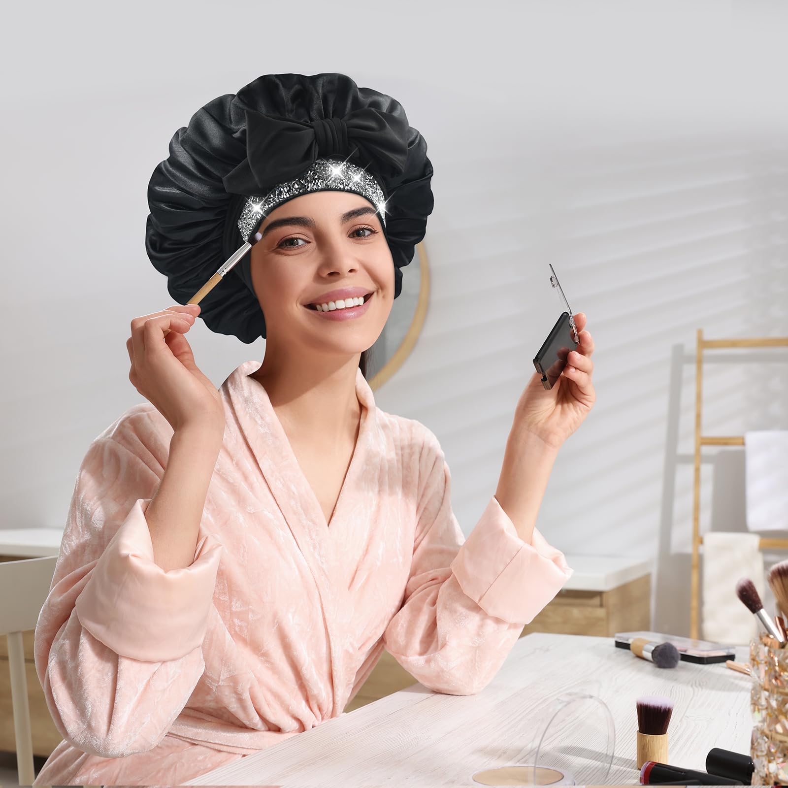 - Bling Bonnet with Tie Band: Our Satin Bonnet attached with a wide soft skin-friendly,high elastic Band, the Band can go across head and the Tie on head, well keep the Satin Bonnet on head over the Night. Specially designed for women and girls. Adorned with dazzling rhinestones, glittering embellishments grace the front of these sleep hats, creating a uniquely beautiful and stylish accessory.