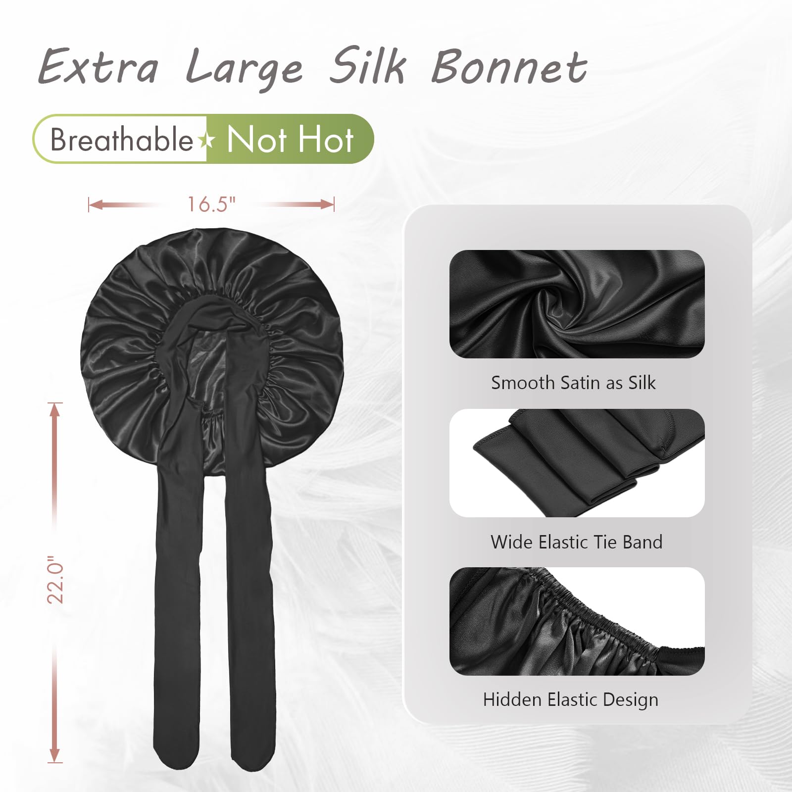 - Premium Silk and Satin Materials: The silk bonnet offers a smooth, friction-free surface that helps reduce hair breakage and frizz while maintaining moisture and shine; The satin bling bonnet, adorned with dazzling rhinestones, not only adds a touch of glamour but also provides gentle protection against tangling and damage.