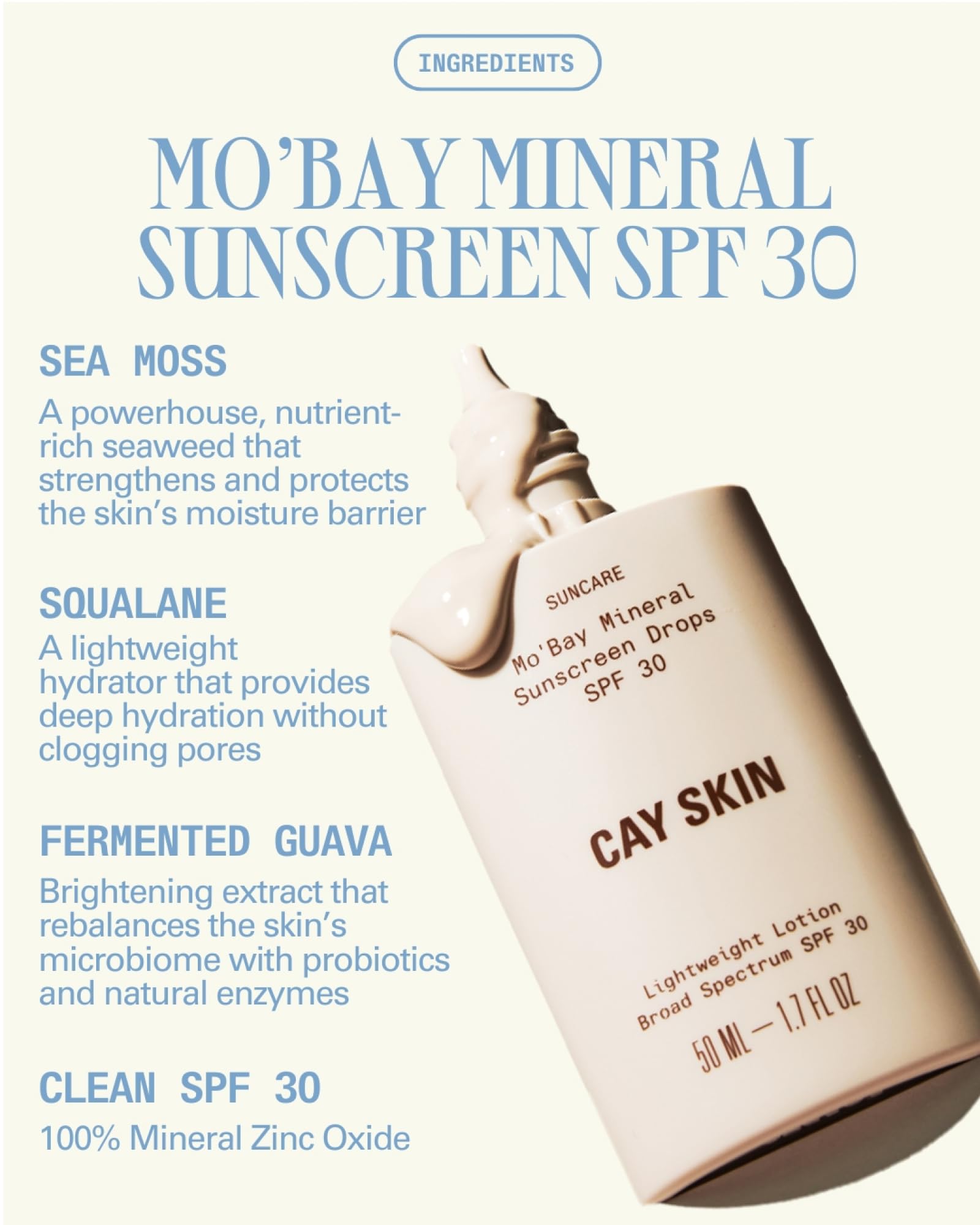 - Suncare Meets All-Day Primer: Mo'Bay Mineral Sunscreen is a 100% mineral SPF 30 lotion that glides over your skin like a serum to provide broad spectrum protection against UVA & UVB rays; this blendable, non-greasy sunscreen also acts as a weightless makeup-gripping primer to lock in your look