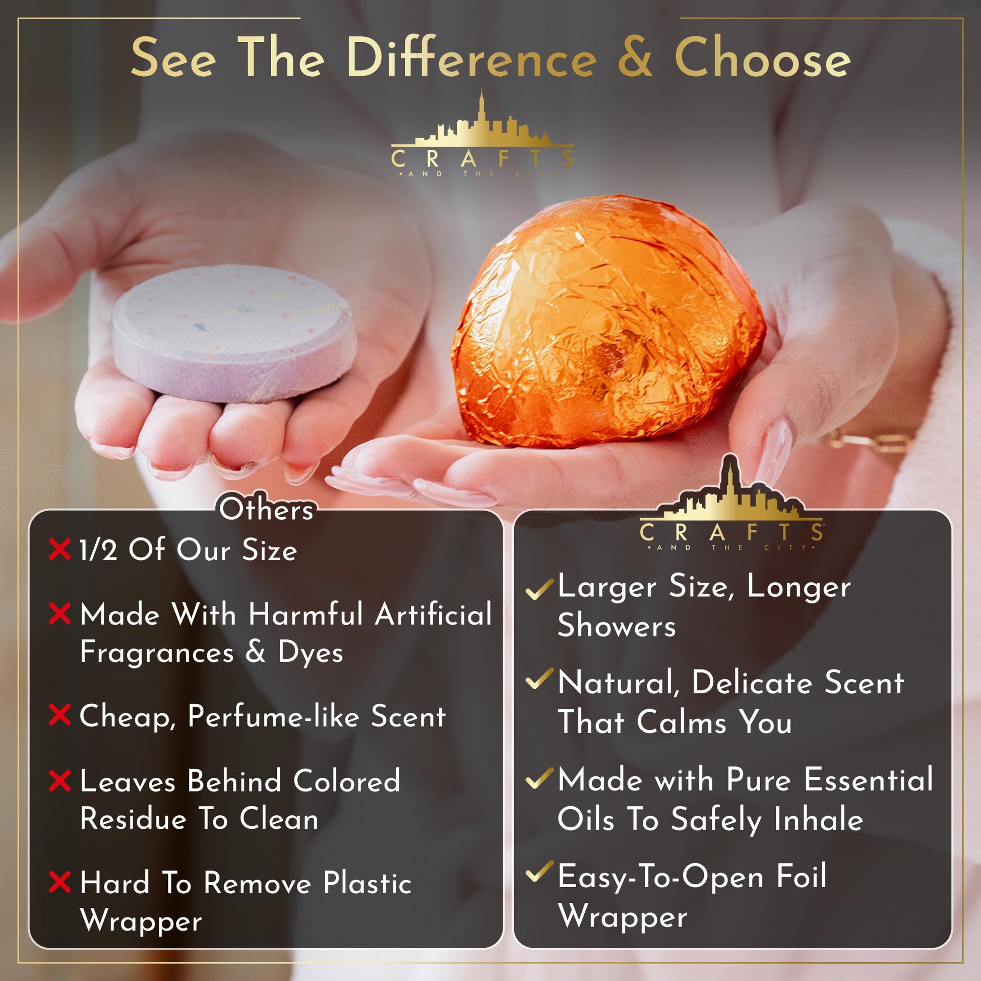 - TAKE YOUR DAY FROM CHAOS TO CALM WITH OUR aromatherapy shower melts! With 6 essential oil shower bombs in 1 shower steamers set, you will forget that long day of work & chores as you smell the aromatic shower steam vapor. Each aromatherapy shower steamer tablet will SAVE YOU TIME unwrapping and cleaning! Foil wrap lets you peel and go! No pesky flowers or colorants like the other shower tabs & disks- Just rinse the fizzy bomb residue away! These are the shower bombs for women who value time!