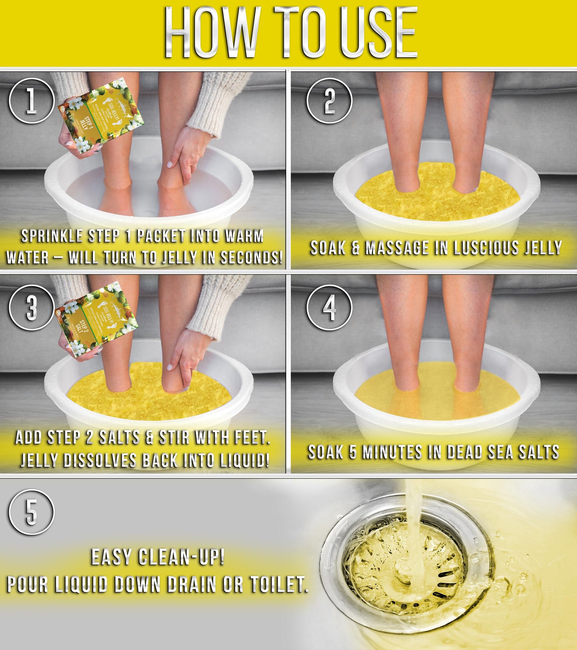 - SAY NO TO THROWING YOUR MONEY AWAY AT EXPENSIVE SALONS that are unclean, rush and overcharge you! Your solution is our 3 jelly pedicure packs for less than 1 spa jelly foot soak for pedicure service at the spa. INDULGE in WARM therapeutic SOOTHING spa water gel that is here to soften calluses & coat your tired feet & toes as you sit right at home in your pajamas! Have a foot soak spa day of relief right at home for your daily remedy! Your feet need our foot spa gel!