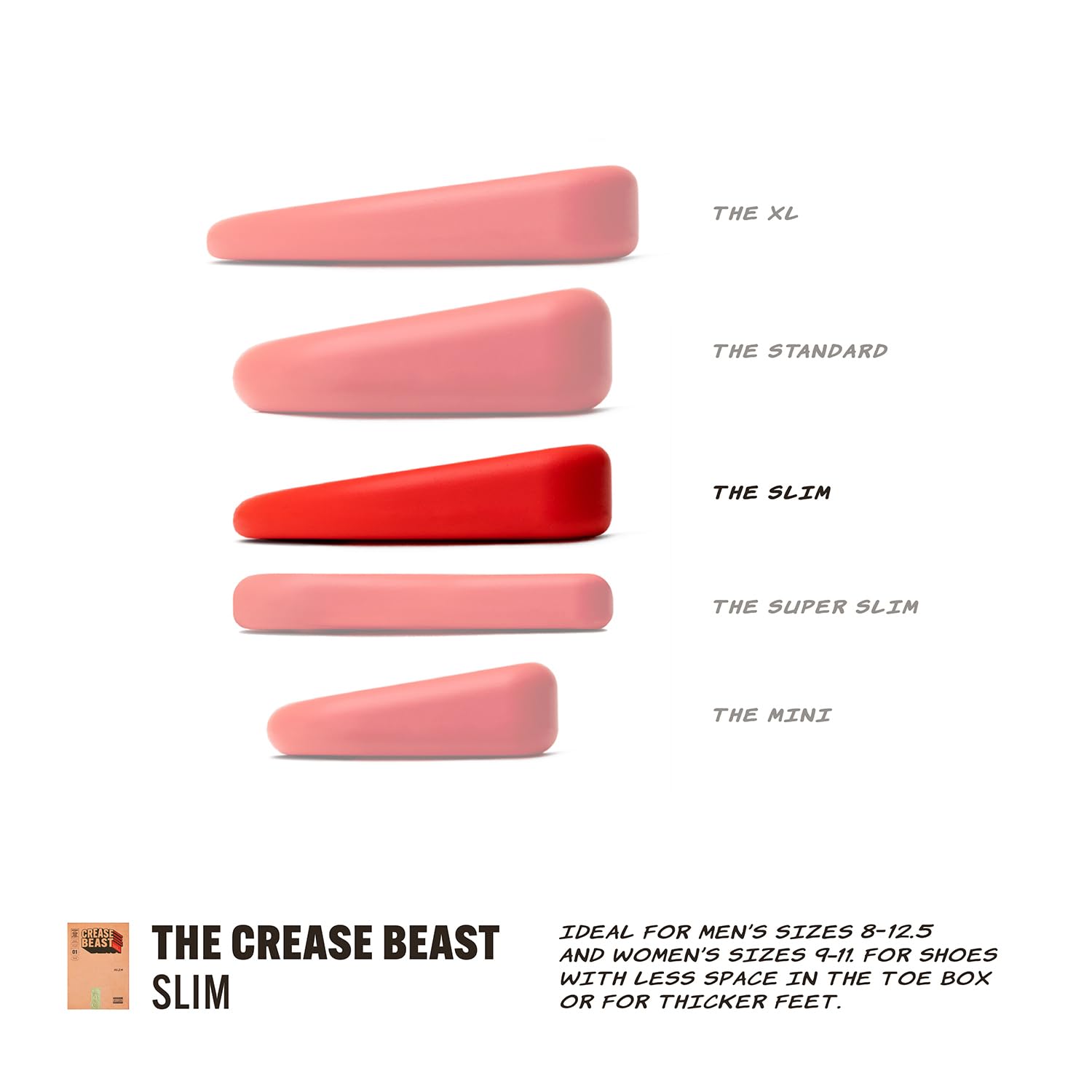 - Designed to Work Together: Pairing Crease Beast Slim with Crease Beast Premium Pocket Socks enhances your crease protection. The socks' seamless pocket holds the memory foam insert firmly in place, preventing shifting and optimizing protection. The Crease Beast Slim is a thinner version of the Standard, perfect for shoes with less space in the toe box or people with thicker feet. It is ideal for men’s sizes 8-12.5 and women’s sizes 9-11, while the Premium Pocket Socks come in Men’s M 8-12 / W