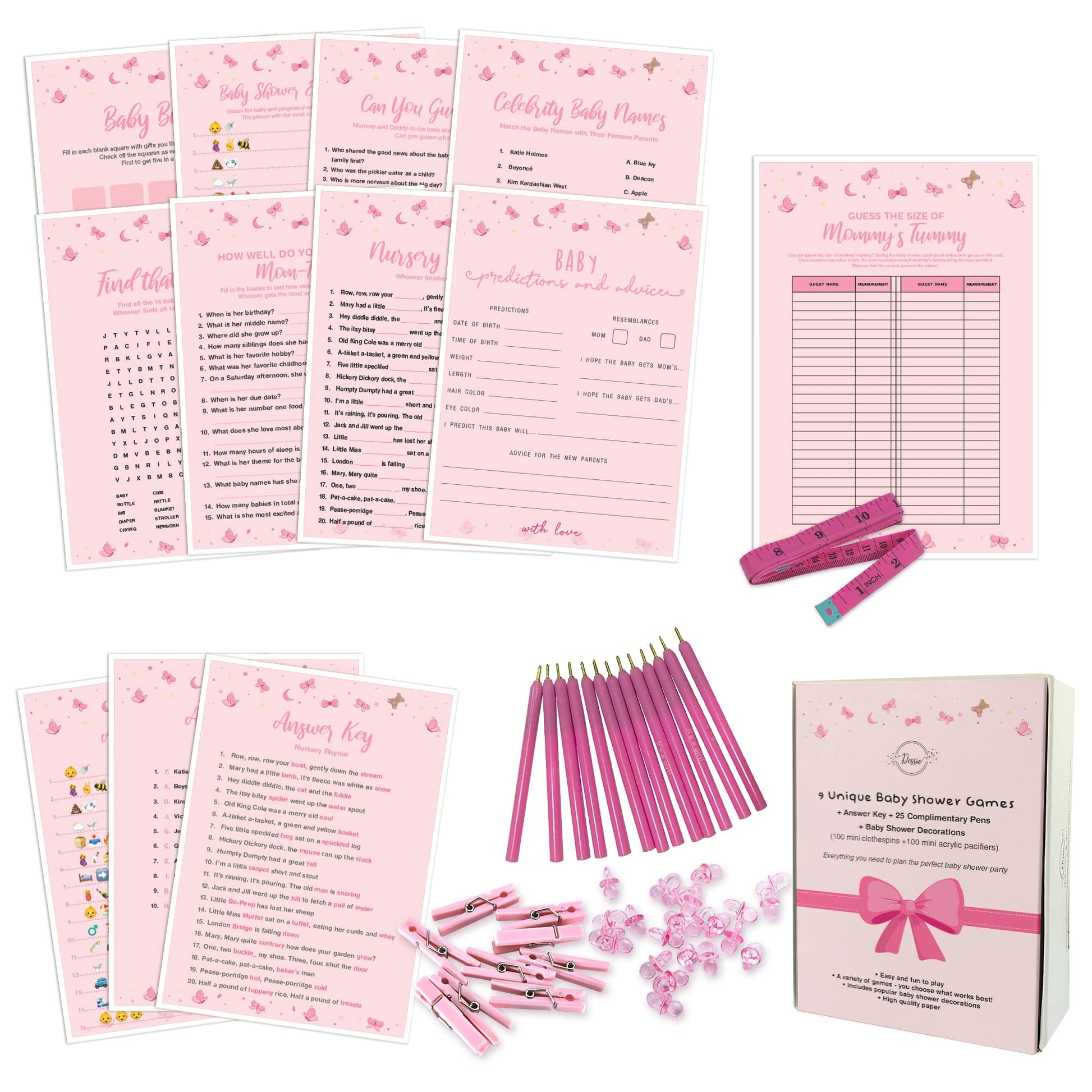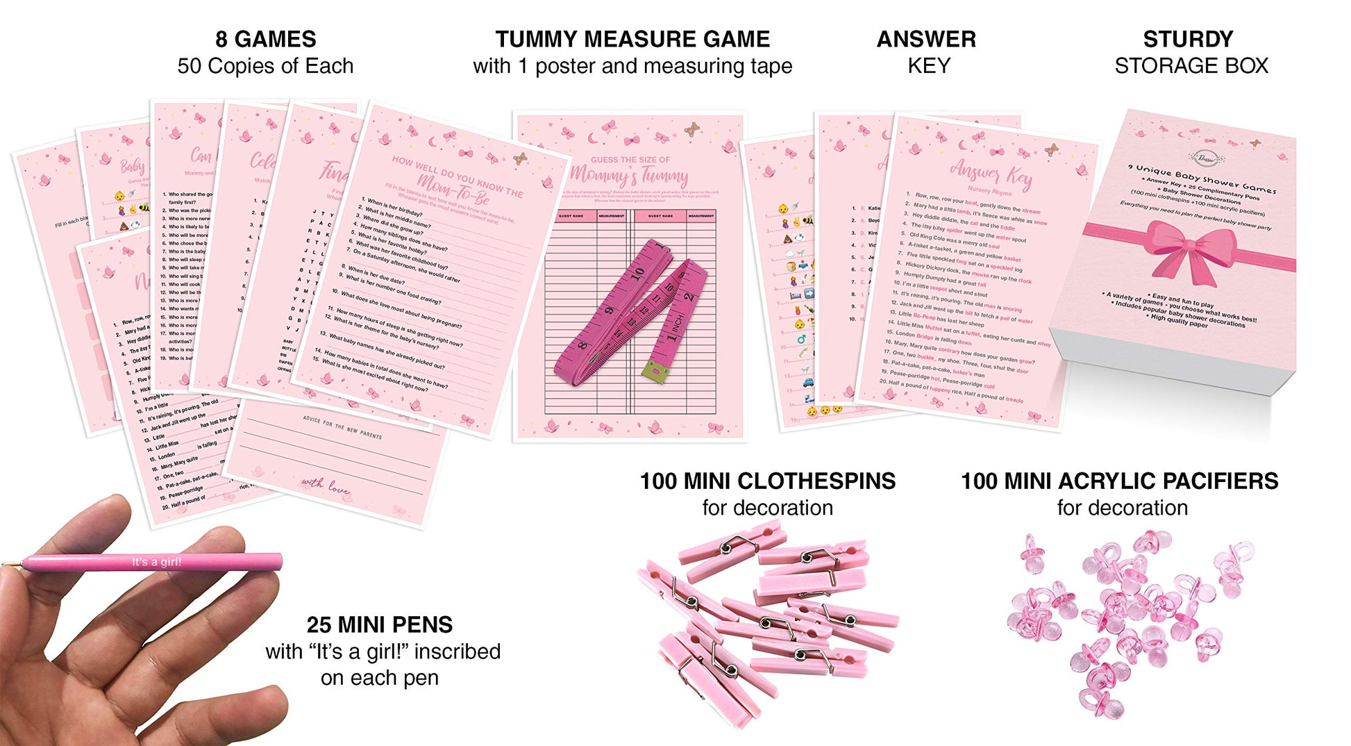 - Ultimate Baby Shower Games For Girl Set: Have a blast with our ultimate baby games for baby shower kit. We've included 8 fun babyshower games (50 copies of each!) and 1 bonus tummy measure game complete with poster and measuring tape, so you can select which games work best for your party. Choose to use them all or save some for the next baby shower!