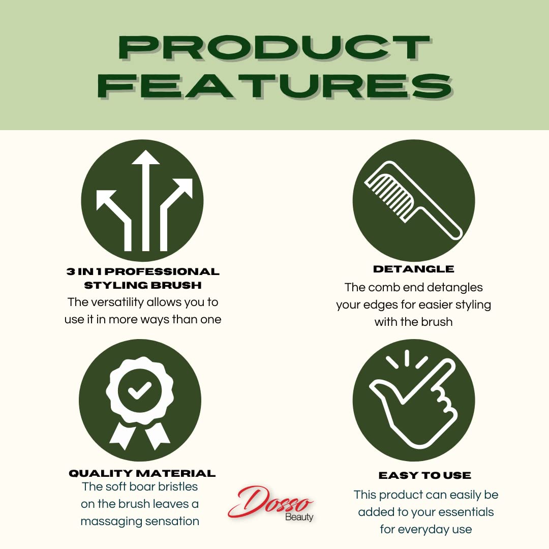 Dosso Beauty 3-in-1 Edge Styling Brush, Black Colour, Baby Soft Bristles, Pointed Metal End-Designed For Partin and Sculpting, Detangles Edges, Organic, Lightweight, Travel Friendly, 9 x 0.5 x 2 inch