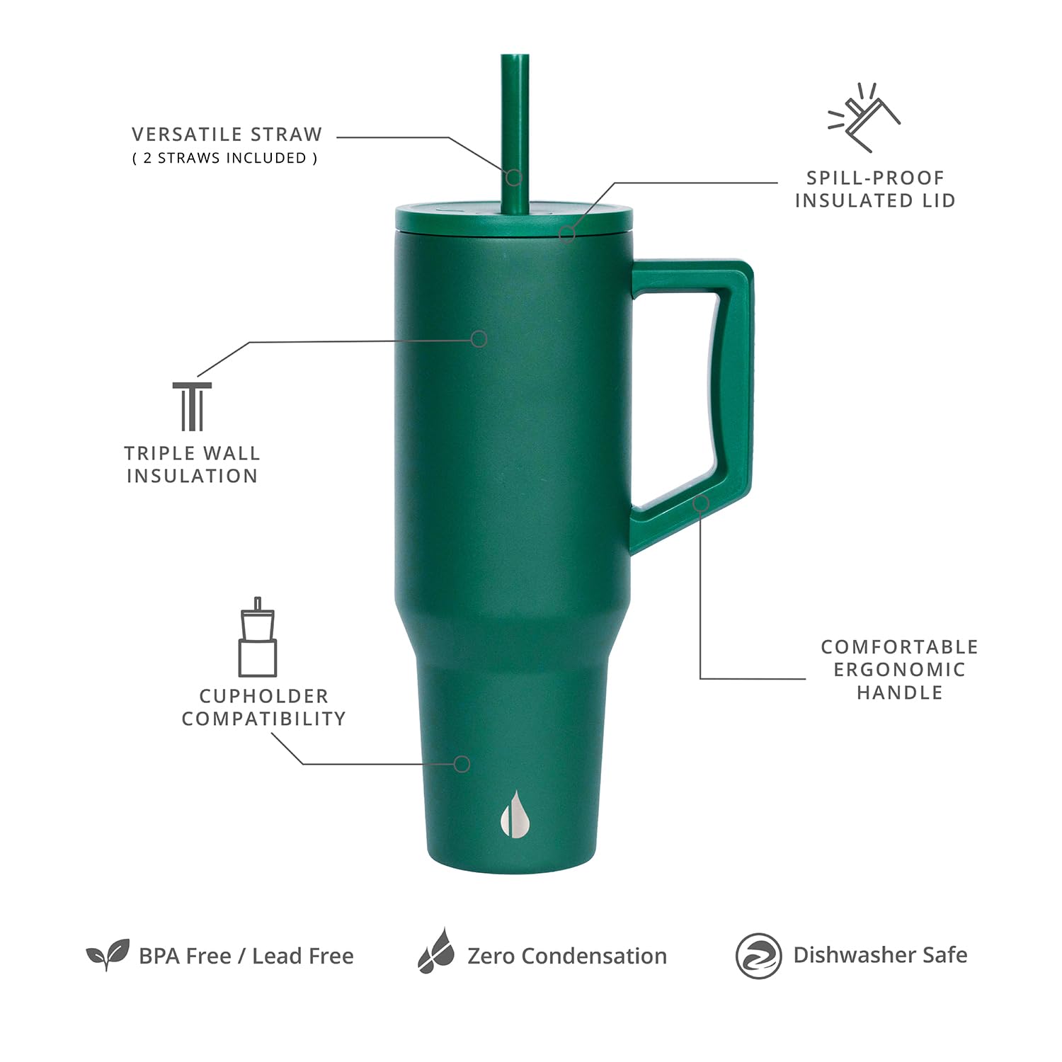 Elemental 40 oz Tumbler with Handle and Straw - Spill Proof Insulated Stainless Steel Commuter for Hot and Cold Beverages - Travel Coffee Mug with 2 Straws & Spill Proof Lid - 40oz - Forest Green