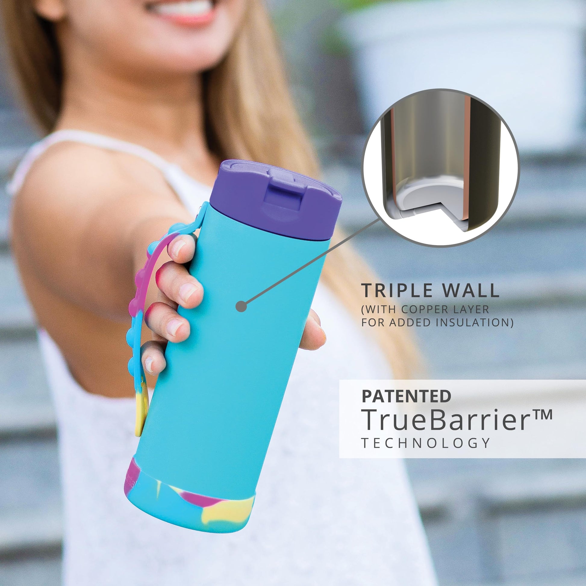 Elemental Iconic Kids Water Bottle with Straw Lid & Stress Relief Pop It Handle, Leak-Proof When Closed, Triple Insulated Kids Stainless Steel Water Bottle For Girls and Boys, 14oz - Blue Tie Dye