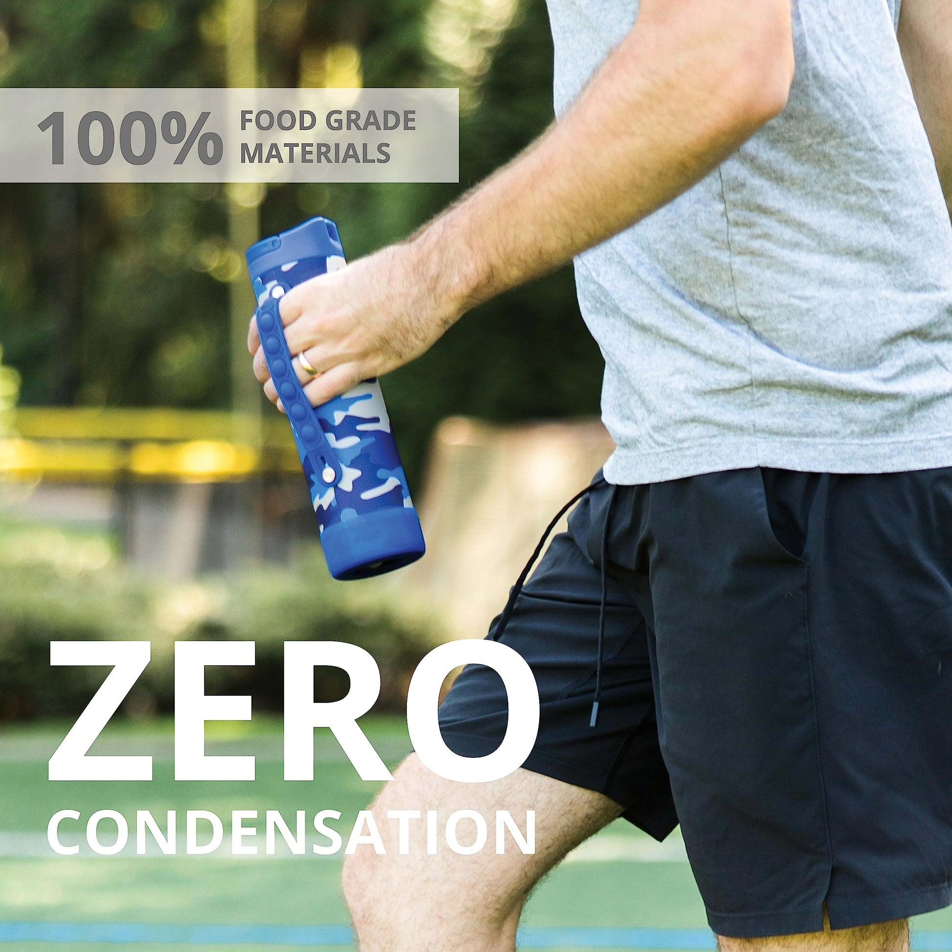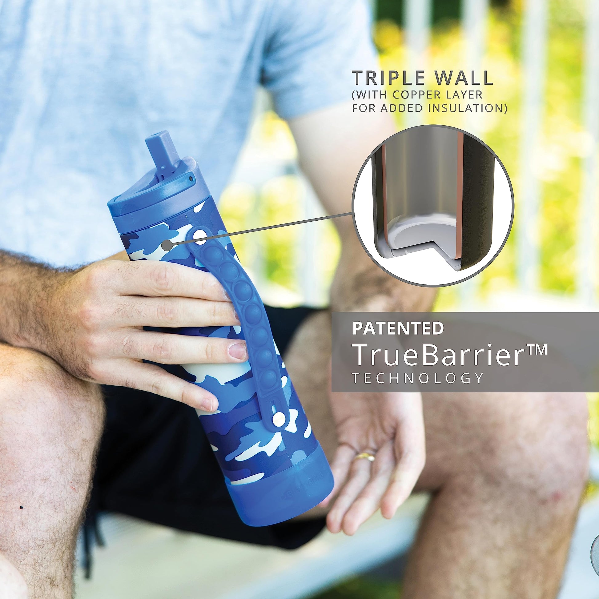 Elemental Iconic Kids Water Bottle with Straw Lid & Stress Reliever Pop It Handle, Leak-Proof When Closed, Triple Insulated Stainless Steel Reusable Thermos Water Bottle, 20oz - Blue Camo