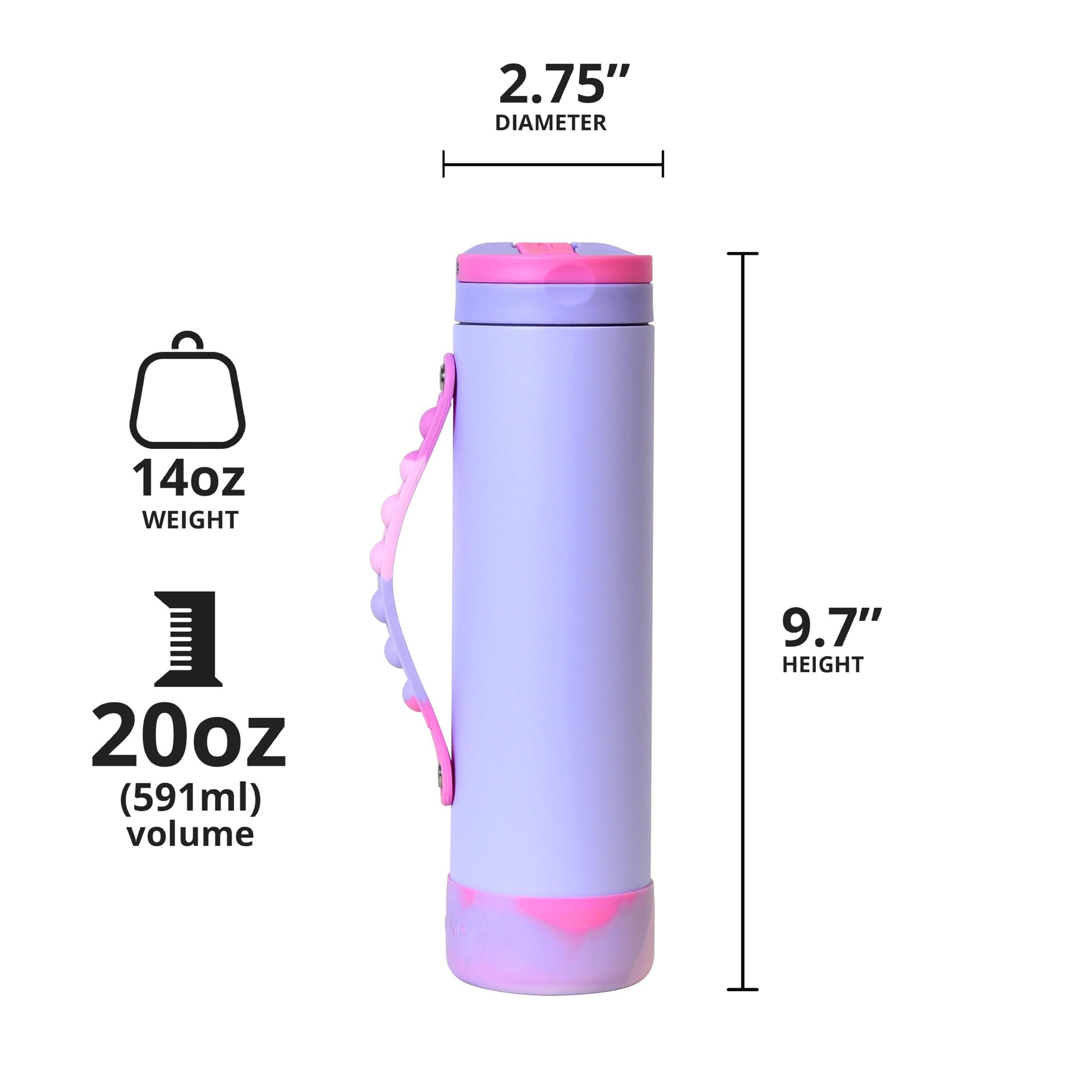 Elemental Iconic Kids Water Bottle with Straw Lid & Stress Reliever Pop It Handle, Leak-Proof When Closed, Triple Insulated Stainless Steel Reusable Thermos Water Bottle, 20oz - Lilac Tie Dye