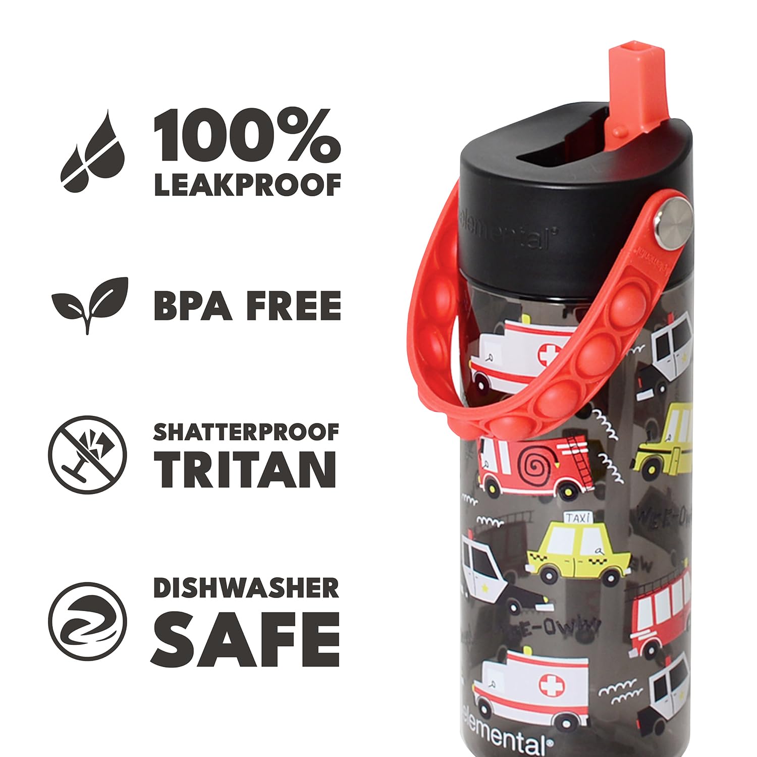 Elemental Leak Proof Water Bottles for Kids - Splash Kids Water Bottle for School with Pop-it Handle - BPA Free Tritan Plastic Reusable Water Bottle with Straw - Service Vechicle - 18oz