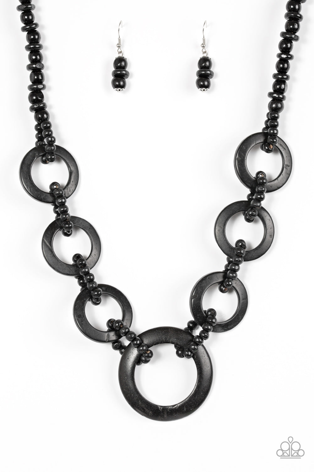 Mismatched black wooden beads are threaded along a black cord for an earthy look. Brushed in a distressed finish, black discs connect with beaded links across the chest for a summery finish.