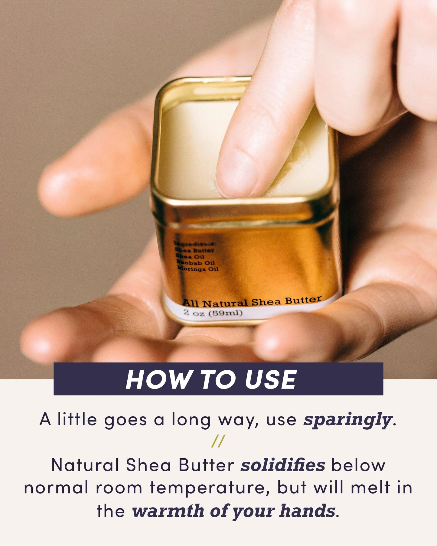 - STORAGE - We recommend storing at room temperature and using within two years of purchase. Natural shea butter melts in warm temperatures, so please open carefully - don't worry though! It's still perfectly good to use. Feel free to toss in the freezer until firm if melting occurs during or after transit.