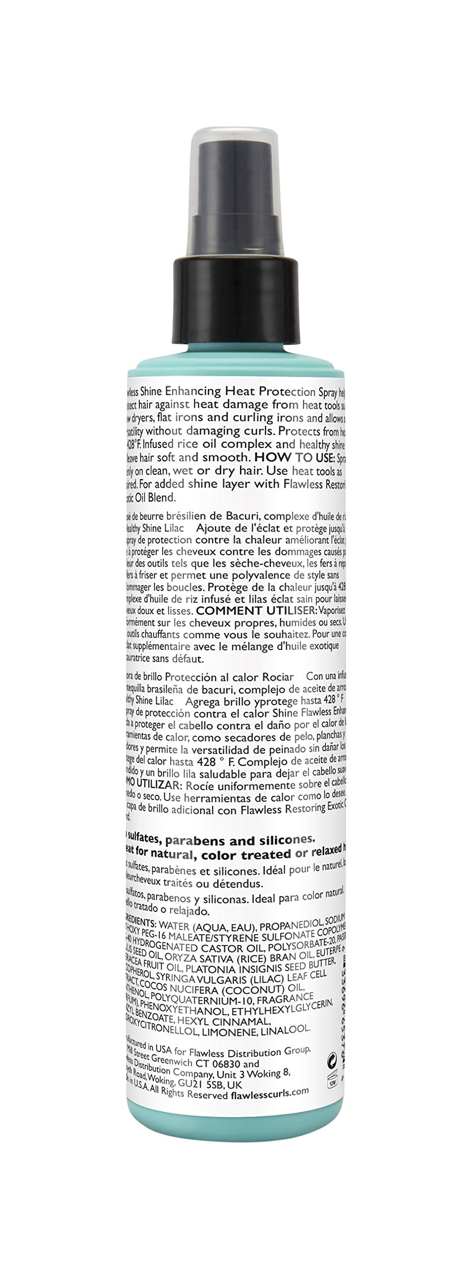 Details: Flawless Shine Enhancing Heat Protection spray helps protect hair against heat damage from heat tools such as blow dryers, flat irons and curling irons and allows styling versatility without damaging curls.