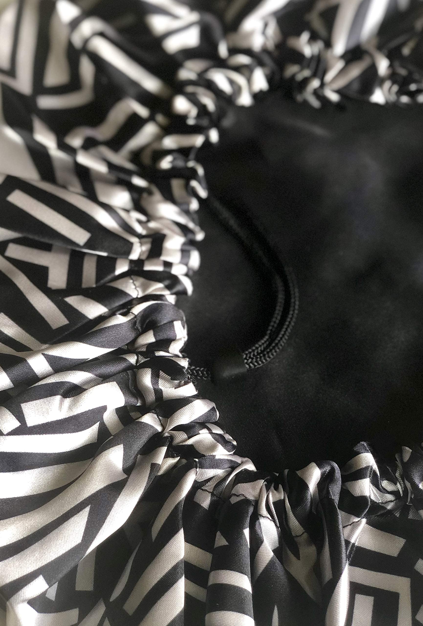 Glow By Daye Satin Bonnet, Double-Layered and Adjustable Satin Sleep Cap, Extra Large, Reversible Afro Geo Print (Black & White Pattern)