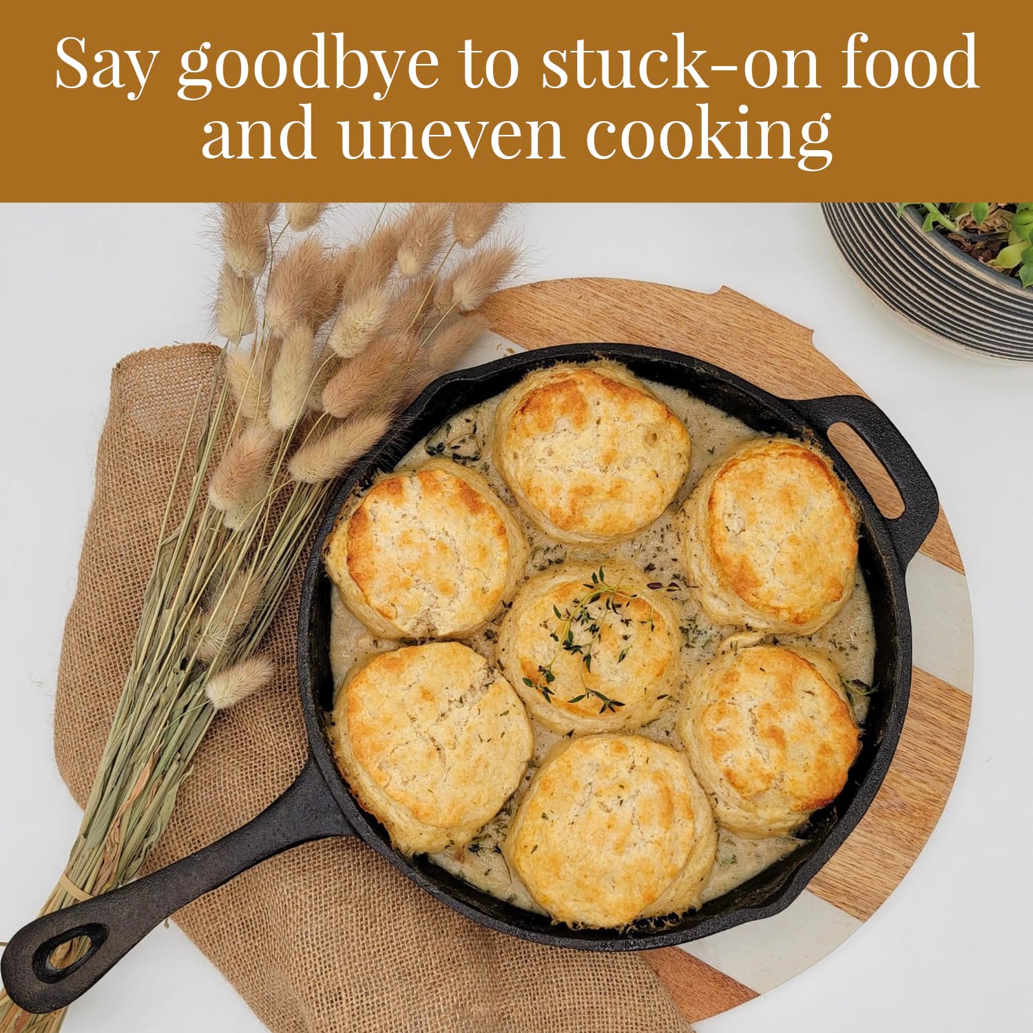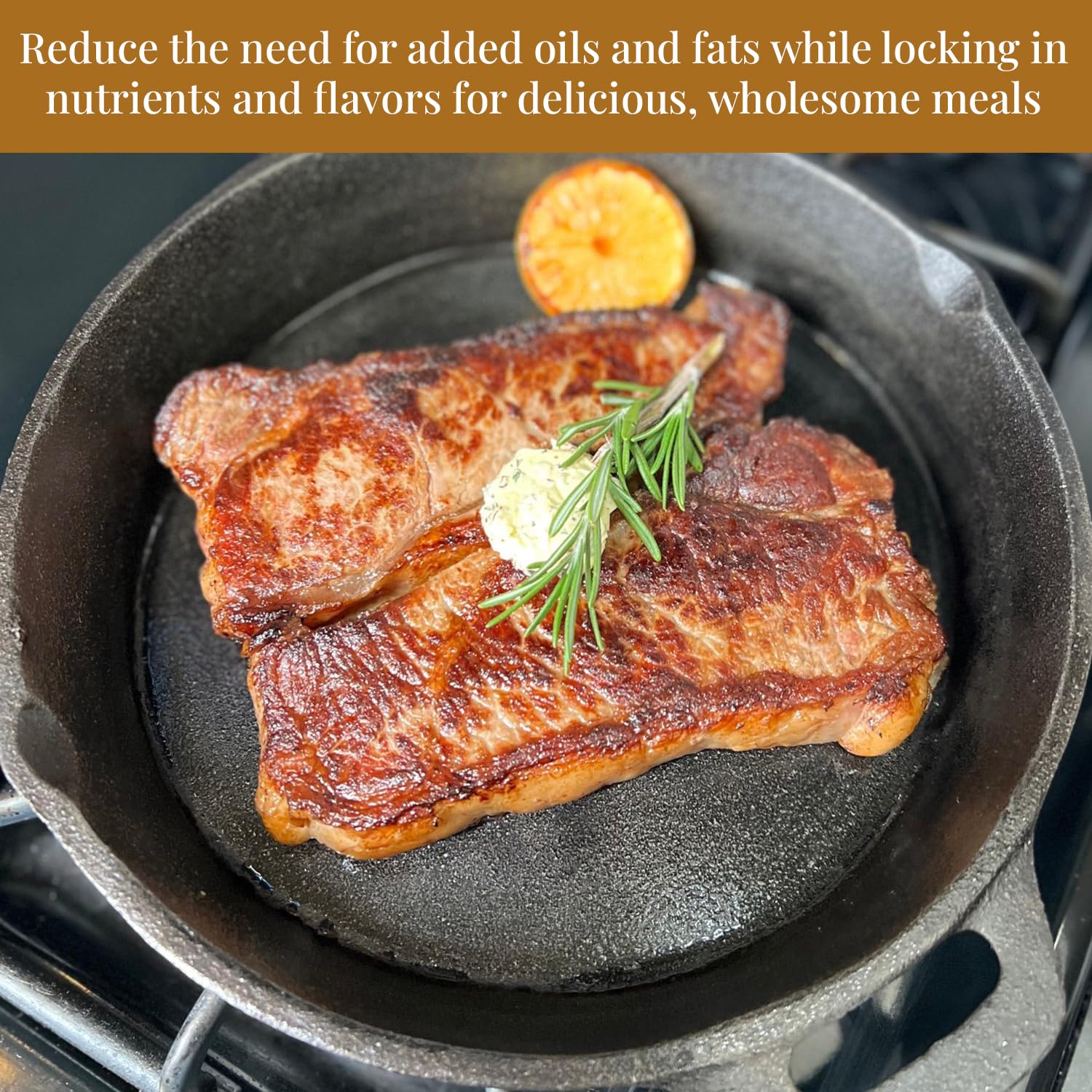 - ✔️ Superior Searing: Our cast iron skillet delivers superior searing capabilities, allowing you to achieve restaurant-quality results at home. From perfectly caramelized steaks to crispy golden vegetables, this skillet locks in flavor.