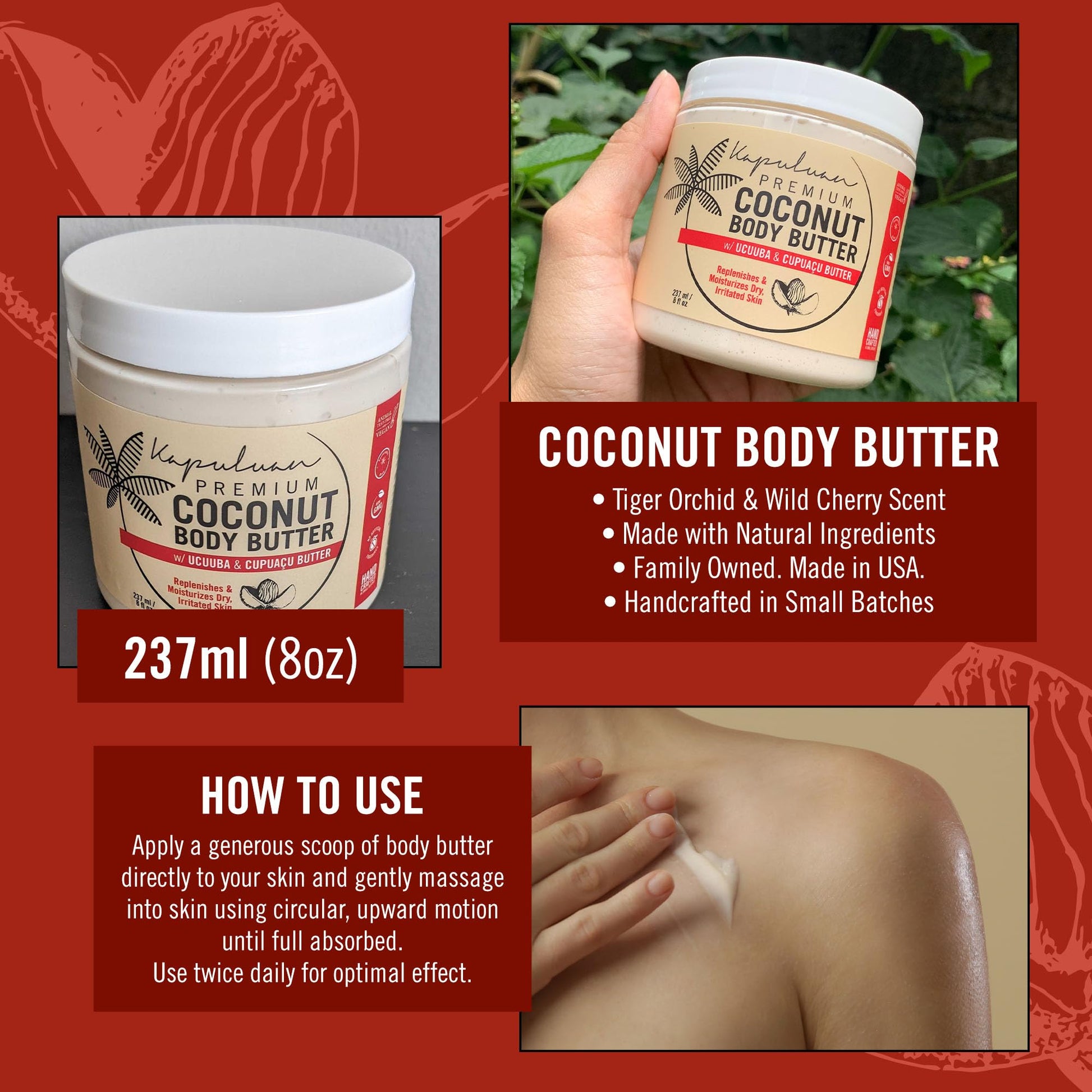 - Kapuluan Moisturizing Coconut Body Butter – Whipped Body Butter with Raw Coconut Oil, Ucuuba Butter & Cupuaçu Butter for all skin types.
