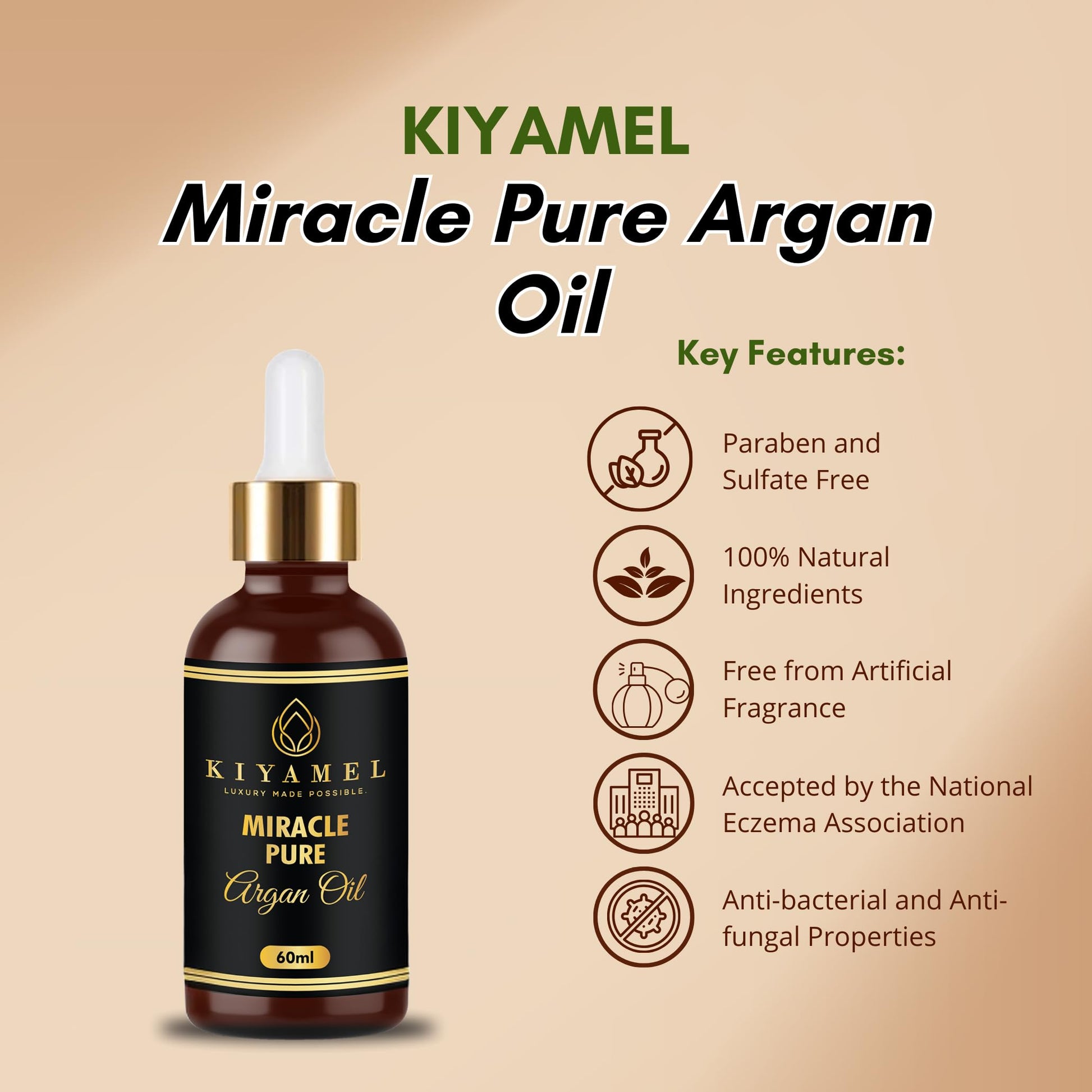 KIYAMEL Pure Argan Oil for Women and Men, Natural Skin Hydrating Vitamin E and Omega 6 Fatty Acids for Stretch Marks, Wrinkles, and Under Eye Bags, Paraben and Sulfate Free