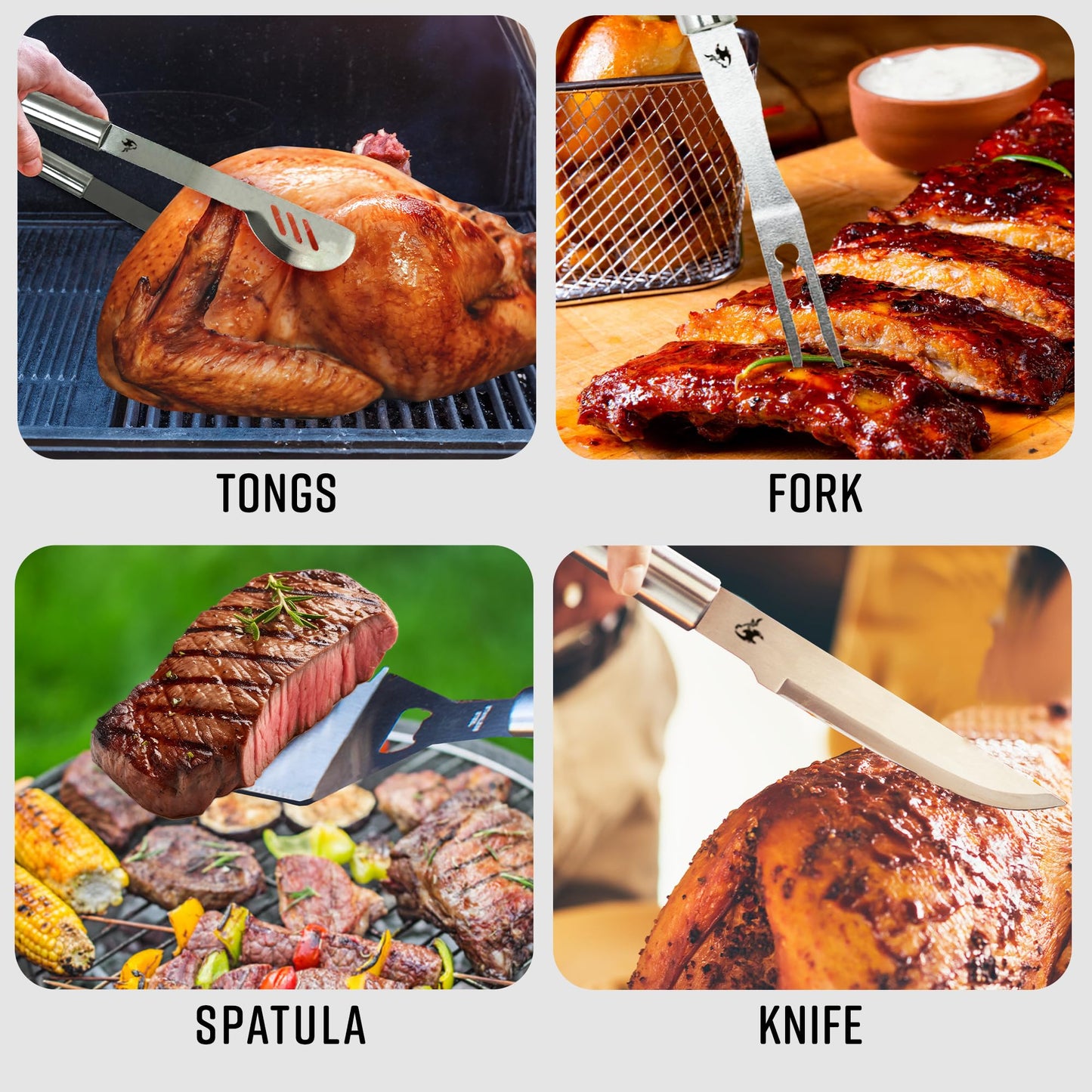 - Premium And Built To Last: Solidly built utensils that you and your loved ones will be proud to hold. Forget about rust. These heavy-duty stainless steel utensils are guaranteed to last. Ergonomically designed for comfort and ease of use; Plus, all the necessary cooking tools the BBQ lover in your life will enjoy: Spatula, Tongs, Large Fork, and Knife