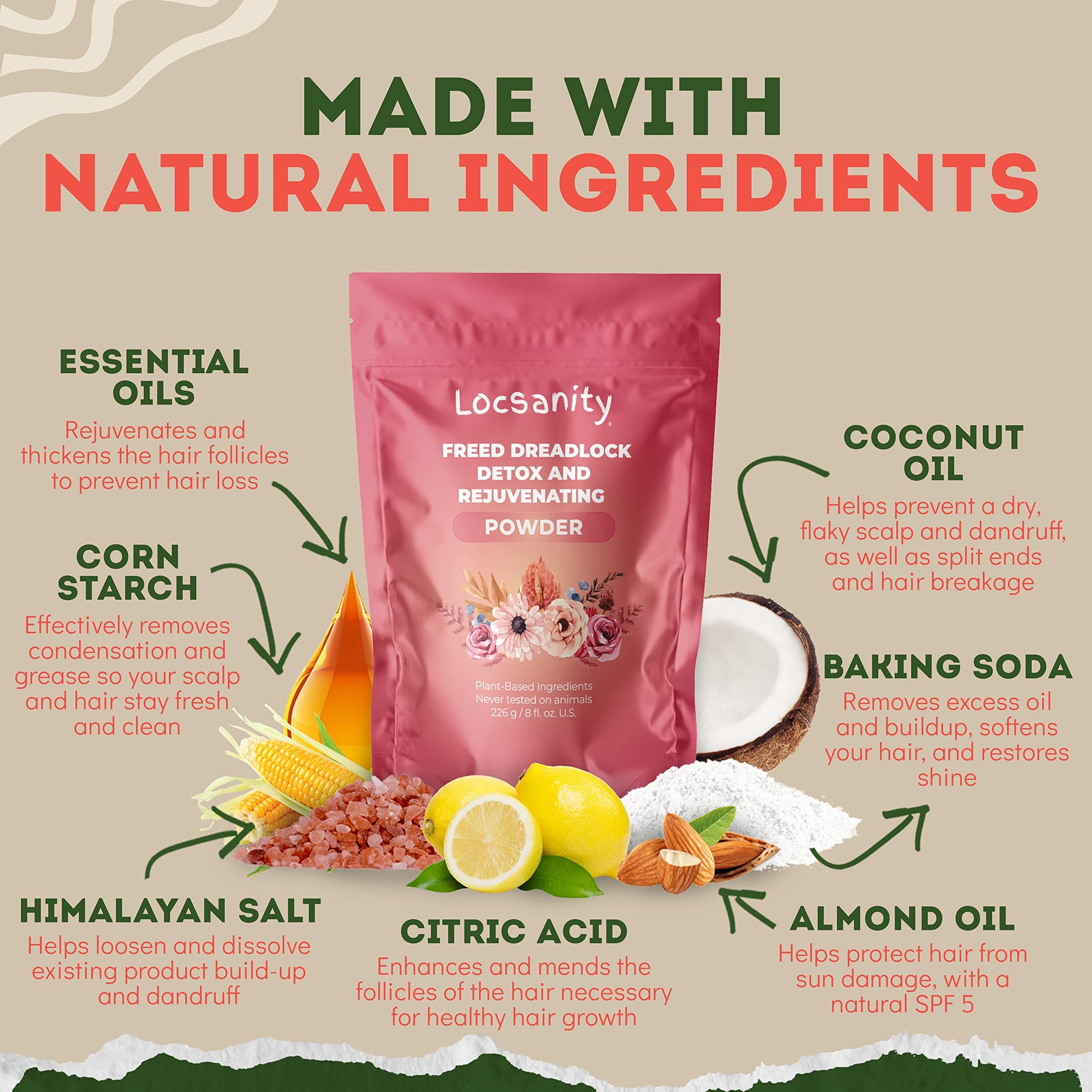 - High-Quality, Plant-Based Ingredients - Our detoxifying dreadlock powder is made of baking soda, citric acid, himalayan salt, coconut and almond oils, and a blend of essential oils. No parabens, mineral oil, or phthalates – just honest, natural hair care for your dreadlocks.