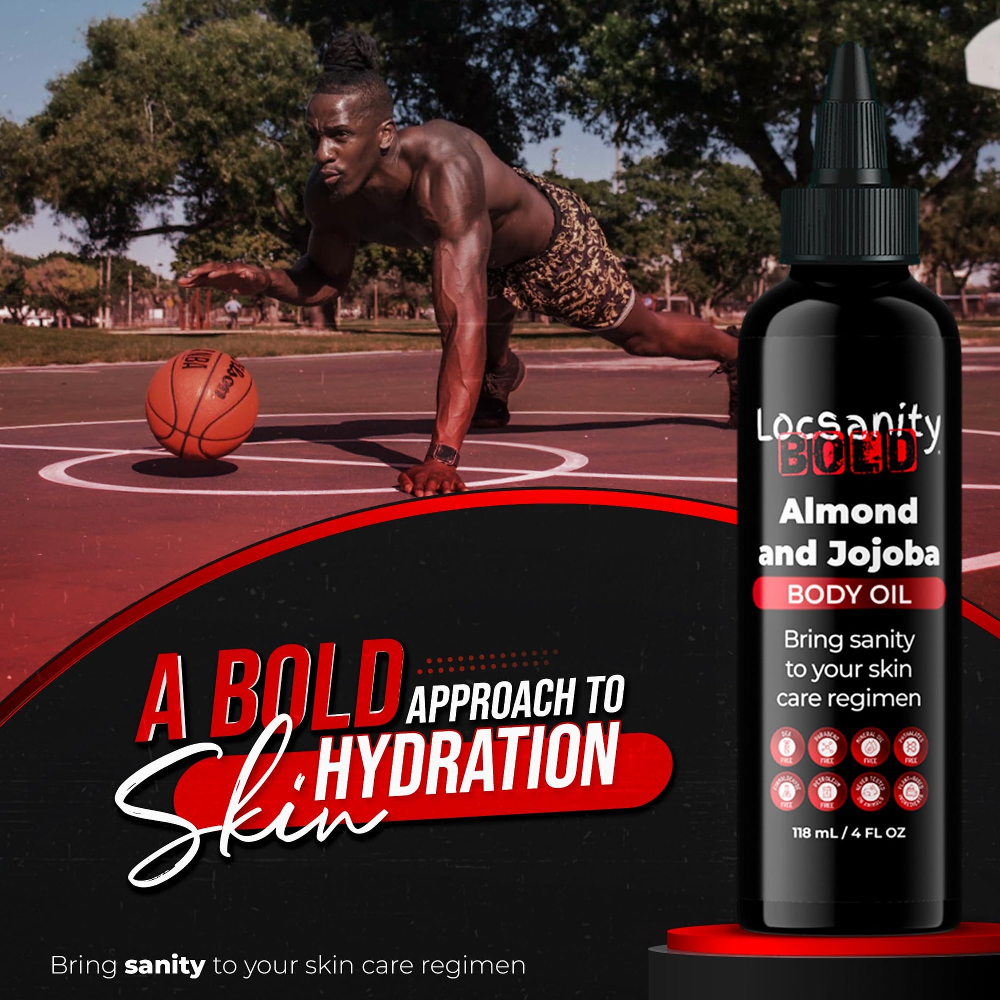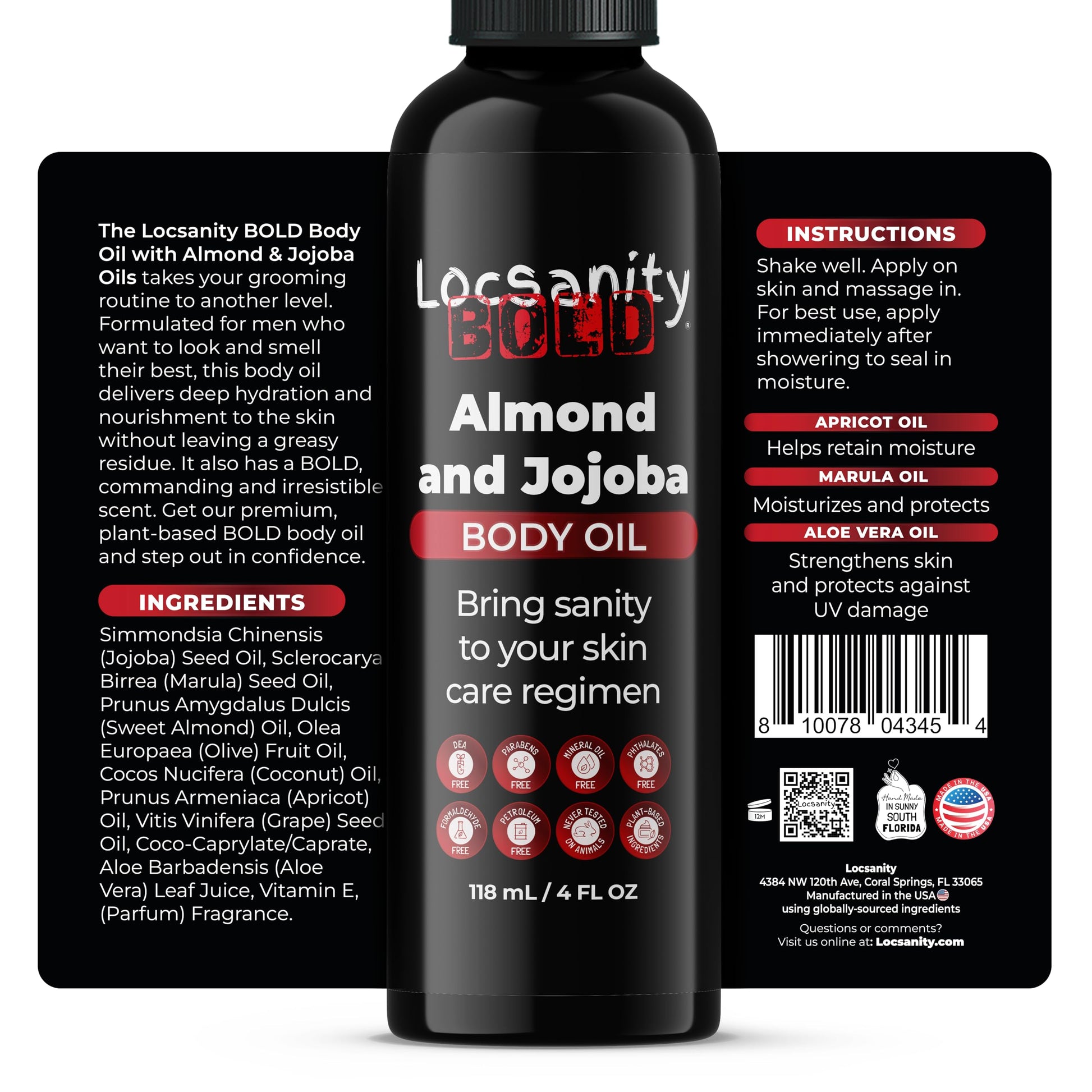 Details: Locsanity BOLD Men's Body Oil is a luxurious blend of nourishing oils that deeply moisturize and rejuvenate the skin. Crafted with a harmonious combination of jojoba seed oil, sweet almond oil, extra virgin olive oil, coconut oil, apricot seed oil, grapeseed oil, marula oil, coco caprylate caprate, and aloe vera oil, this body oil is a true indulgence for your skin. Jojoba seed oil, rich in vitamins and minerals, mimics the skin's natural oils, providing deep hydration without leaving a greasy residue. Sweet almond oil, packed with vitamin E, nourishes and protects the skin, while extra virgin olive oil, helps combat signs of aging. Coconut oil, with its moisturizing properties, soothes and softens the skin. Apricot seed oil, rich in vitamins A and E, promotes skin elasticity and radiance. Grapeseed oil, a lightweight oil, absorbs quickly and imparts a silky smooth feel. Marula oil, a natural emollient, deeply conditions and revitalizes the skin. Coco caprylate caprate, a plant-derived emollient, enhances the absorption of the oils, while aloe vera oil, known for its soothing and healing properties, calms and soothes the skin. This luxurious body oil is a must-have for men seeking a pampering experience and a radiant, healthy glow.