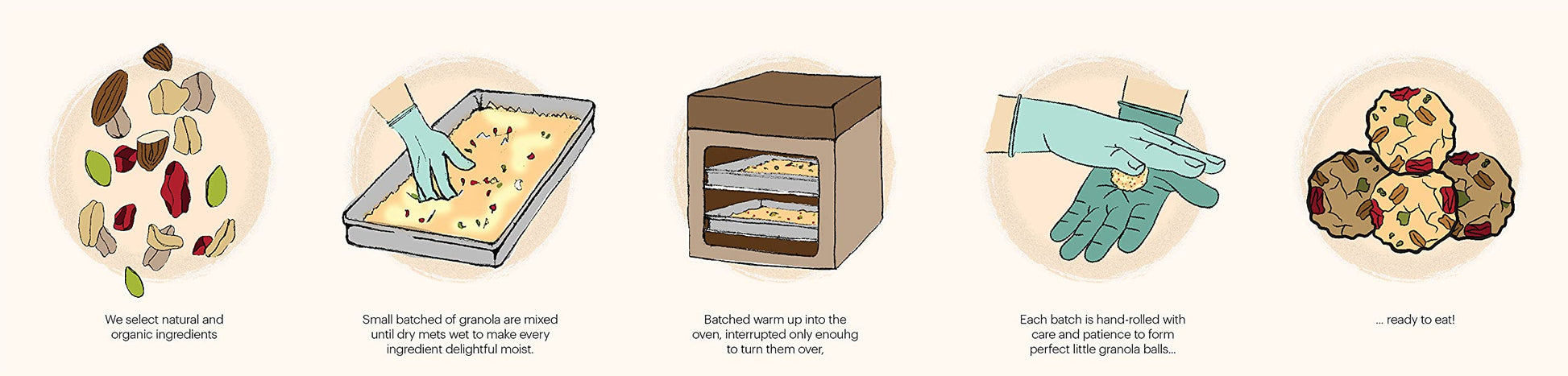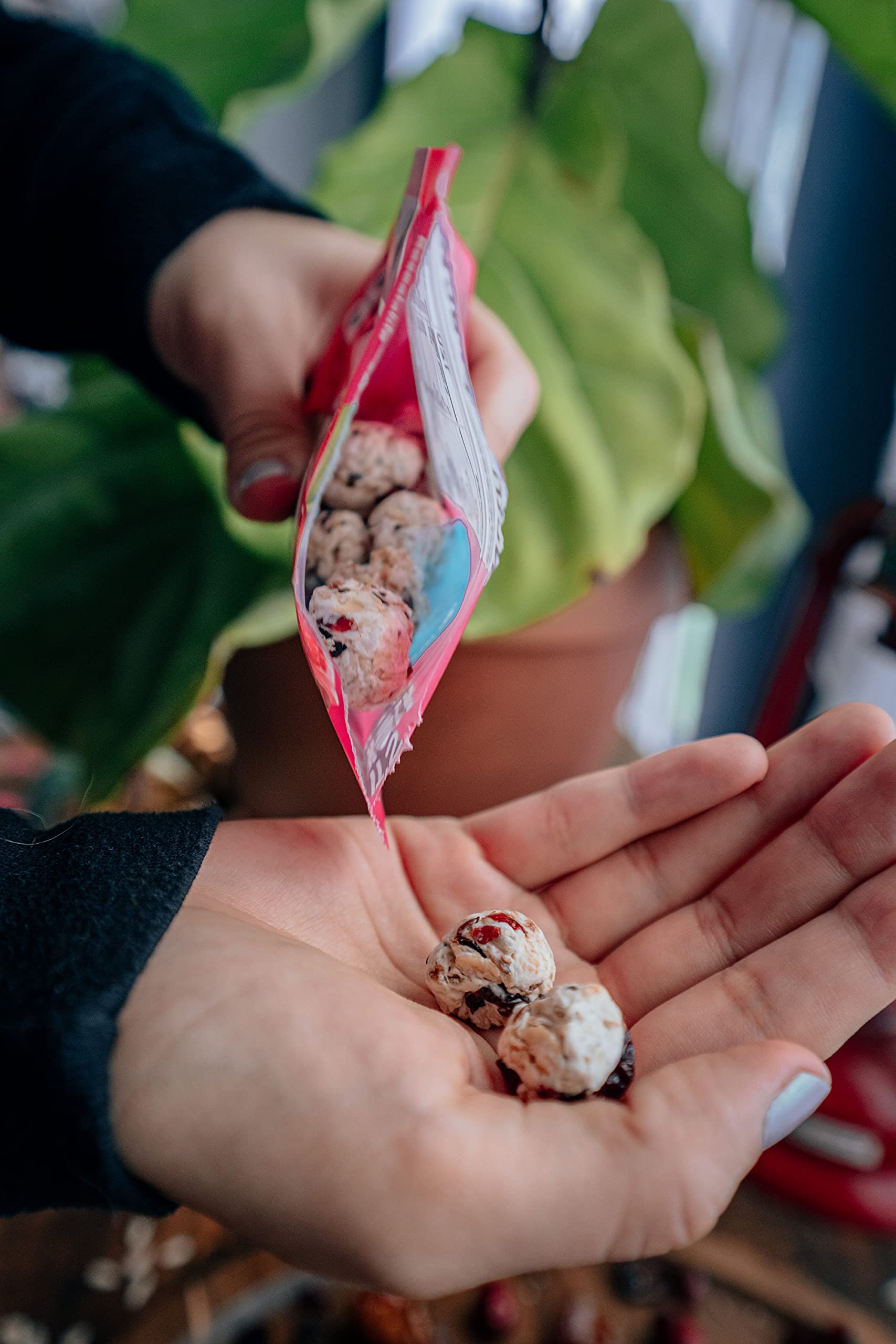 - 1.9 oz bag of a delightful combination of ethically-sourced rolled oats, sunflower seeds, chia seeds, pumpkins seeds, flaxseeds, cashews and sea salt. But the star of the show is CRANBERRY - deep burgundy color and tart flavor joined by the sweet and nutty taste of coconut, rolled into a compact ball.