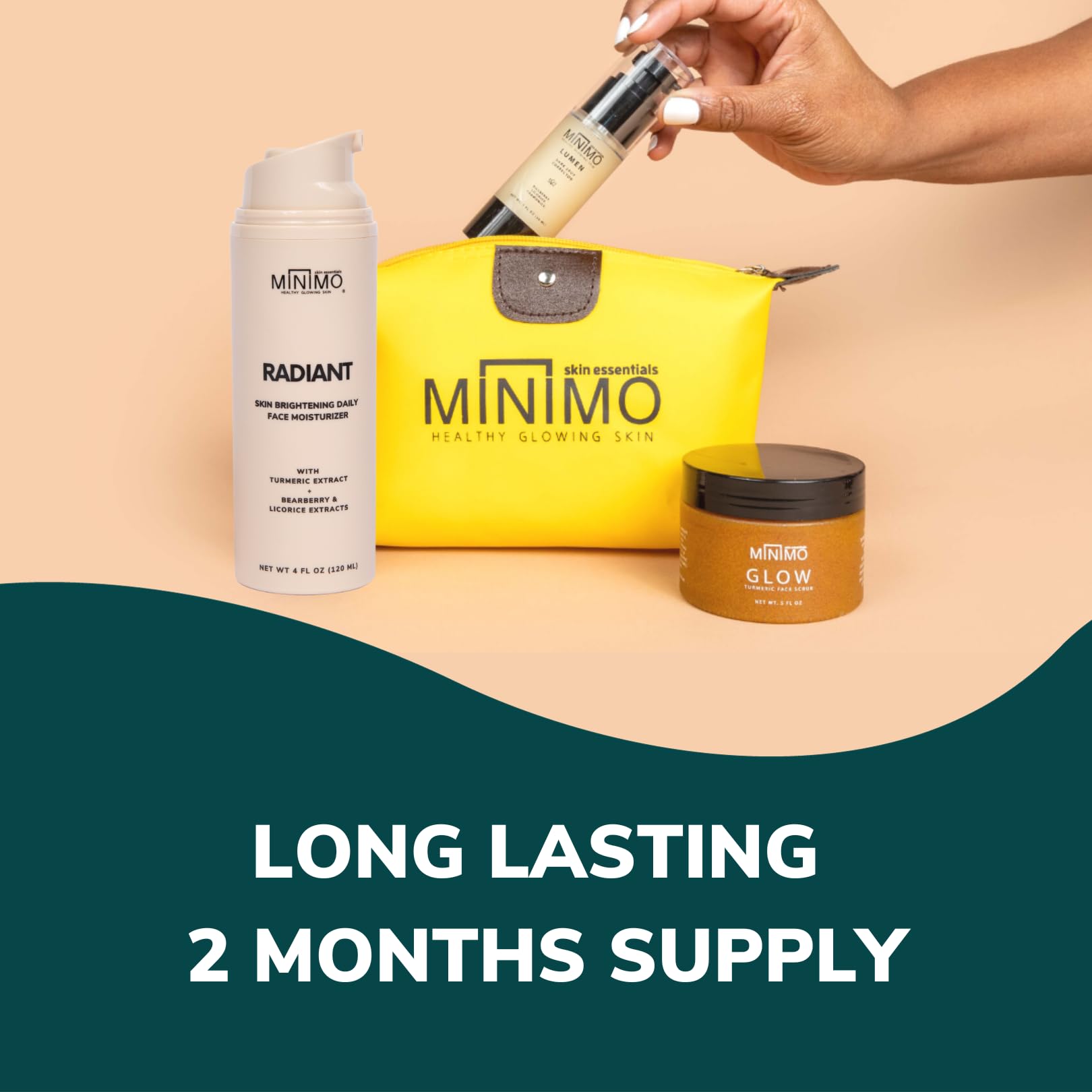 Minimo Skin Essentials Glow Starter Pack for Dull, Uneven Skin Tone Promotes a Glowing Complexion 3 Full Size Products, Applicator, & Makeup Bag Included