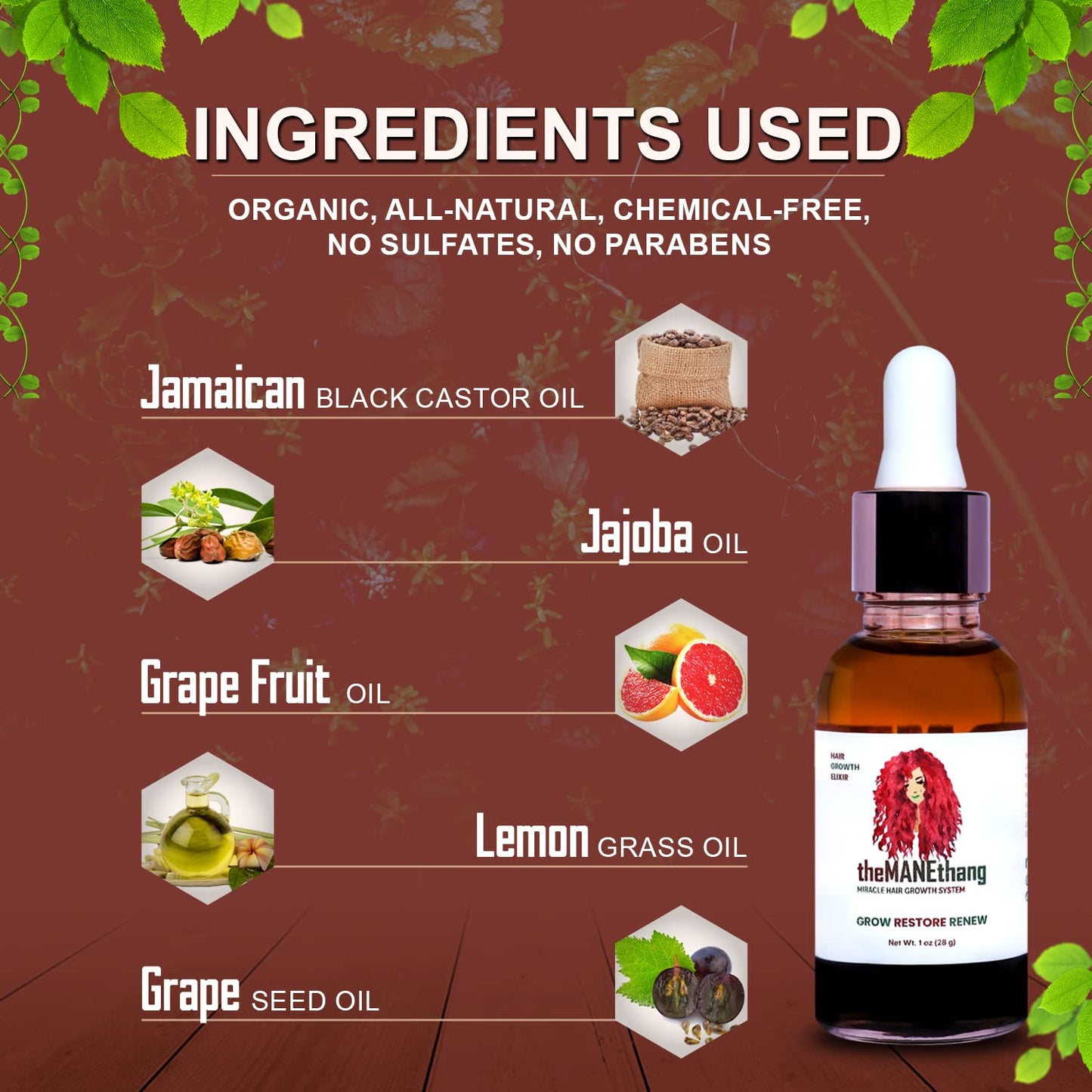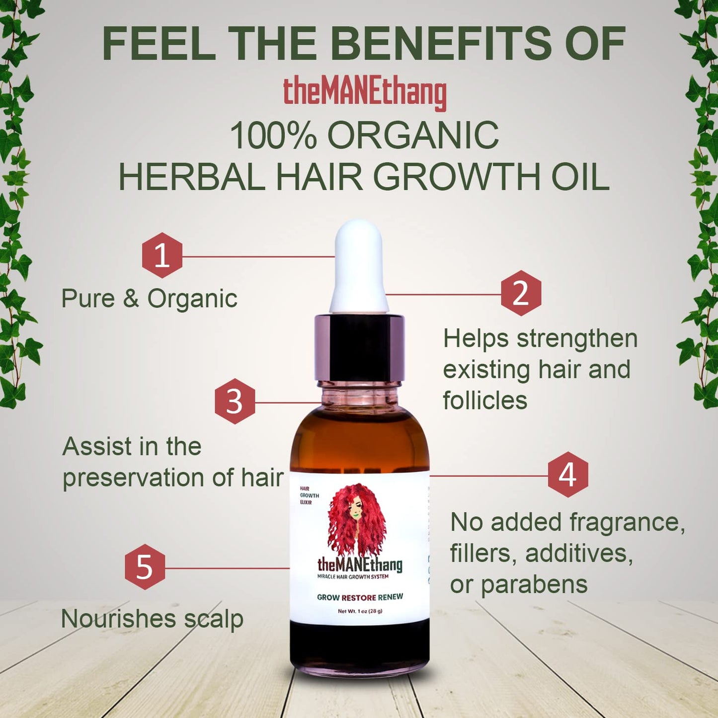 - theMANEthang oil for hair growth is a wonderful combination of jojoba and Castor oil with the infusion of over 30 natural herbs to stimulate hair growth at its root while improving hair texture