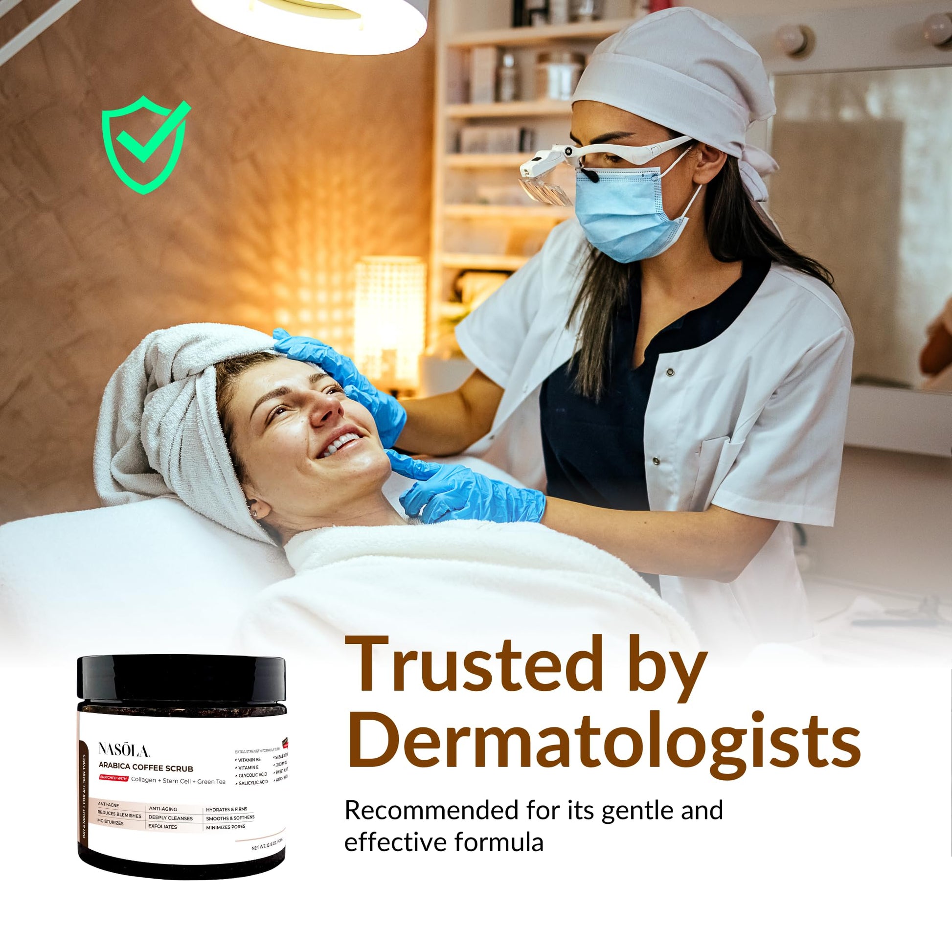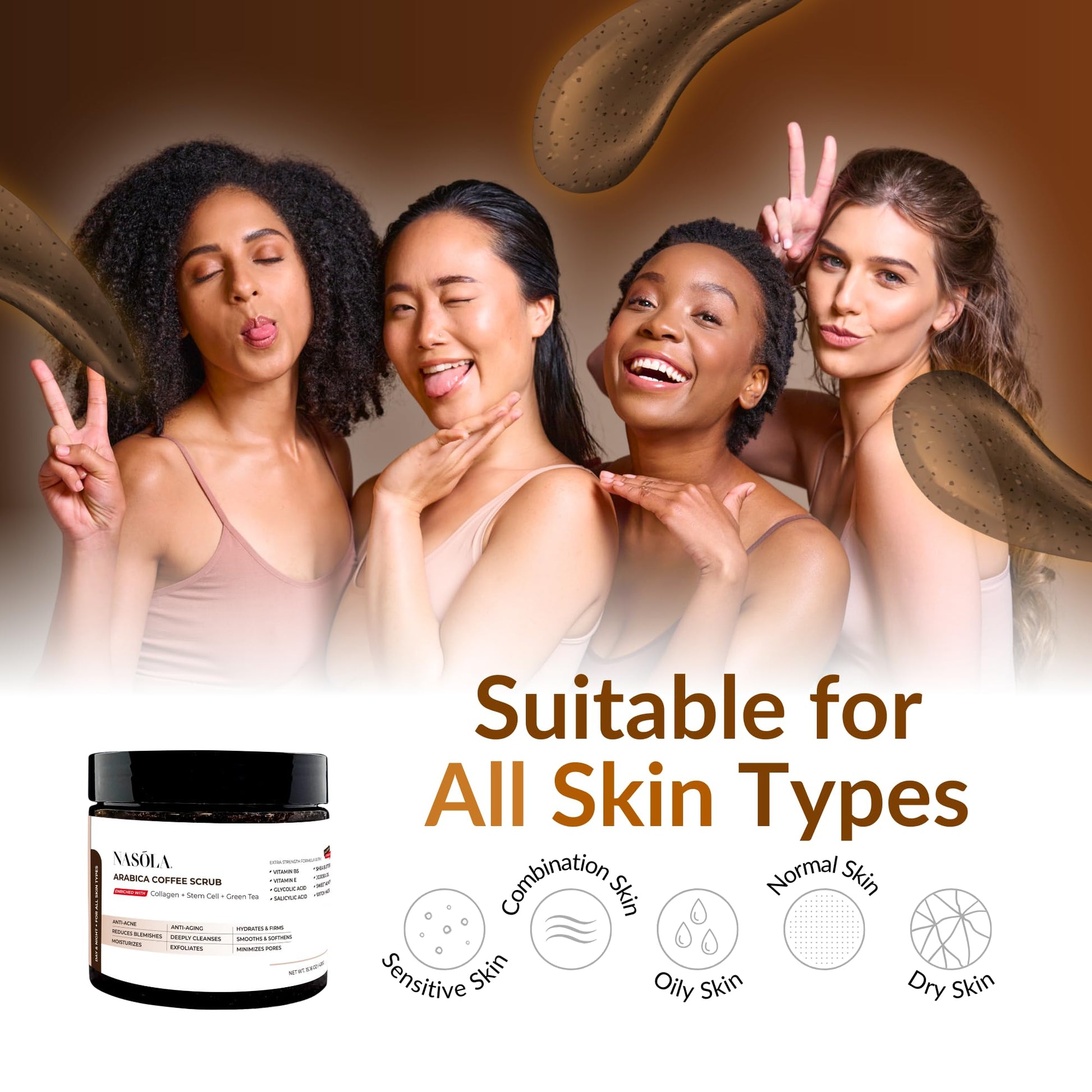 Nasola Arabica Coffee Body Scrub with Collagen, Green Tea & Stem Cell – Exfoliating Body Scrubber & Face Cleanser – Coffee Scrub for Wrinkles, Stretch Marks, and for Smoother Skin, 15.16 Oz