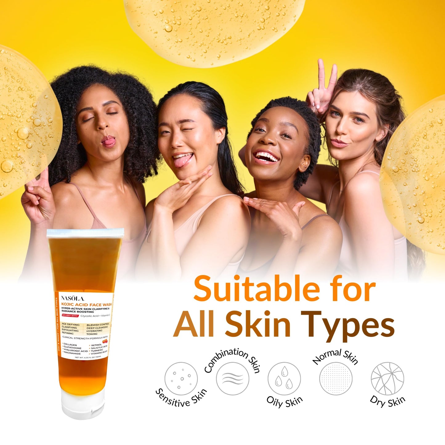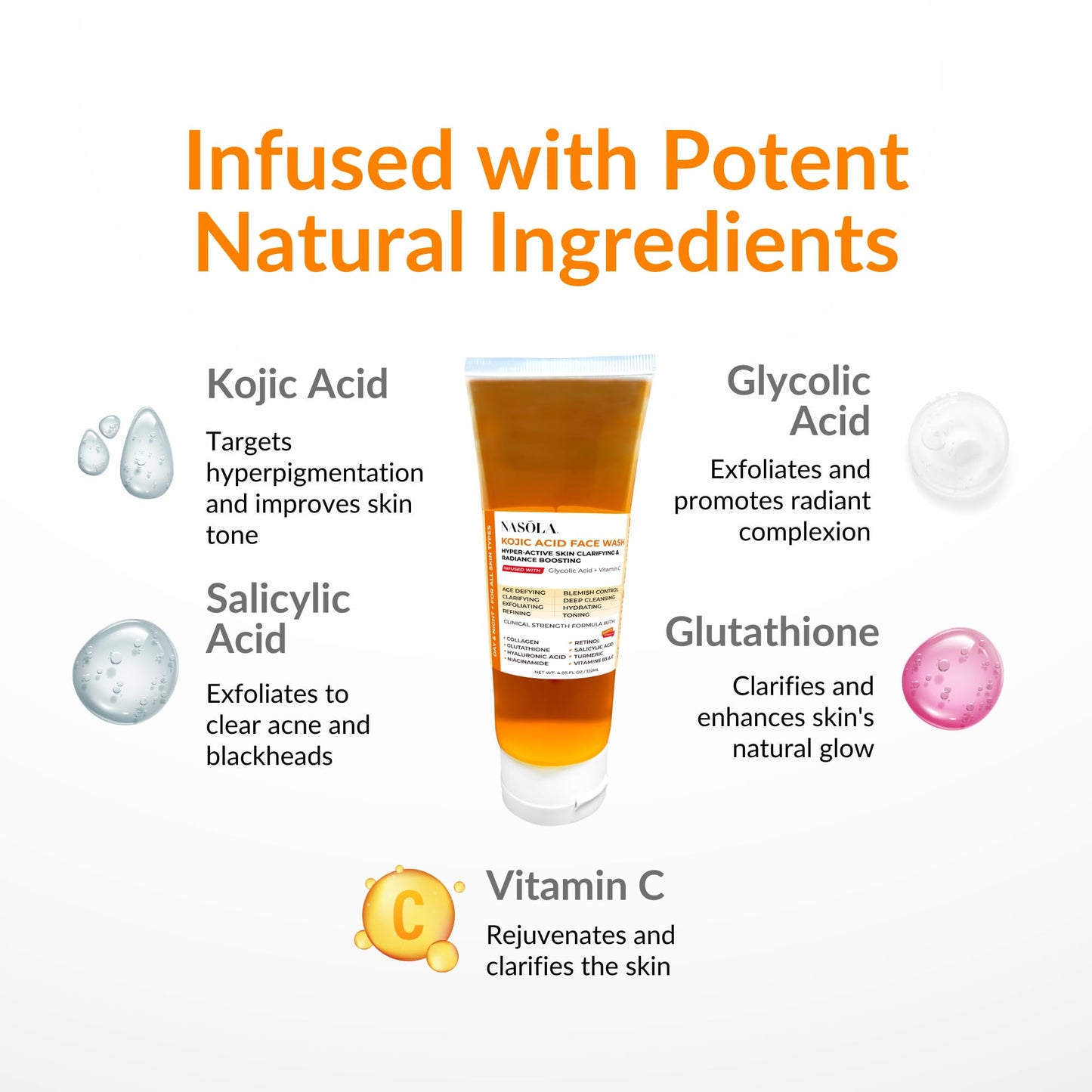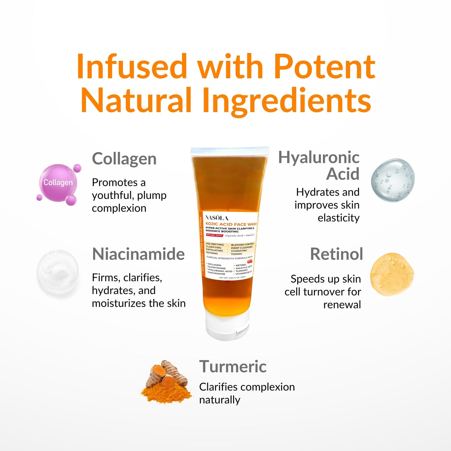 Details: Elevate your daily skincare routine with the transformative power of Nasola's organic facial cleanser Kojic acid soap, Nasola Kojic Acid Face Wash Clarifying Cleanser. Delicately formulated with nature's elite ingredients, this face wash is your passport to a rejuvenated, radiant complexion. Immerse your skin in the luxurious blend of Kojic Acid, nature's revered skin clarifying secret, harmoniously combined with Vitamins C, B5, and E. Experience the soothing whispers of Turmeric and the clarifying touch of Niacinamide. Every drop promises to gently lift away impurities, excess oil, and stubborn makeup residue, unveiling skin that's pristine and renewed. But the magic doesn't end there. Glycolic Acid, Salicylic Acid, Glutathione, and Retinol join forces, pioneering a formidable defense against acne, signs of aging, and lifeless skin. Revel in the hydrating embrace of Collagen and Hyaluronic Acid, ensuring every pore is drenched in moisture, leaving your skin feeling soft, youthful, and vibrantly alive. Our unique formula caters to men and women, striving to accentuate a radiant glow. Watch as discolorations, blemishes and complexion inconsistencies retreat, pores minimize, and fine lines fade into oblivion. With every wash, step closer to the skin you've always dreamed of - luminous, radiant, and irresistibly smooth. Nasola takes pride in offering products that are 100% natural and organic. Every bottle of our face cleanser is a testament to our commitment to purity, efficacy, and sustainability. It's more than just a daily facial care product; it's a ritual, a moisturizer, and an irreplaceable component of your skincare journey.