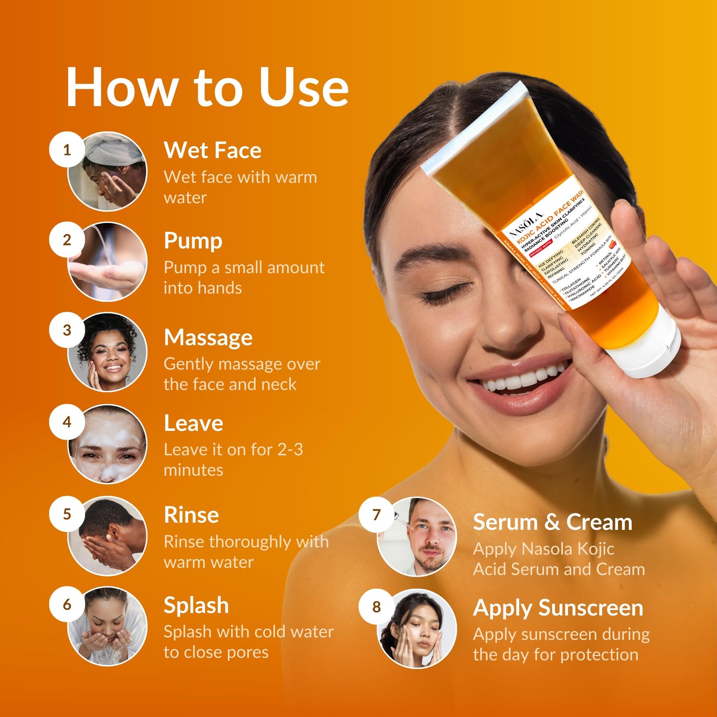 - ULTIMATE FACIAL CLEANSING EXPERIENCE: Dive into a refreshing facial cleansing journey that maintains an optimal pH balance. Our face wash, enriched with the potency of Kojic Acid, Vitamins C, B5, and E, along with Turmeric and Niacinamide, ensures every impurity, makeup residue, and excess oil is swept away, leaving your skin pristine and rejuvenated.