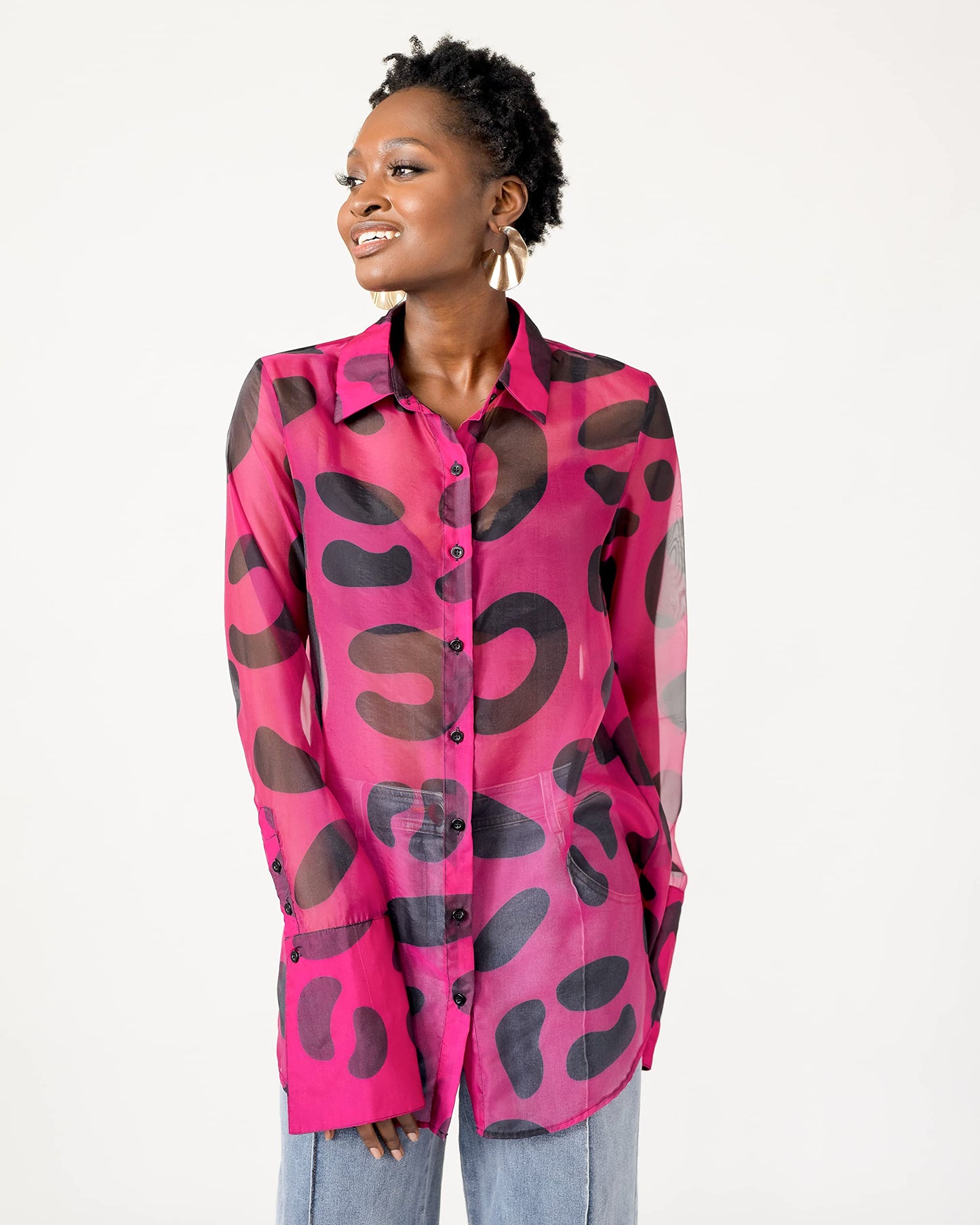 - Statement button up with unique print make this a one of a kind essential piece from Pantora. Can be paired with the Linda crop top and worn open or buttoned for a more sophisticated look day or night.