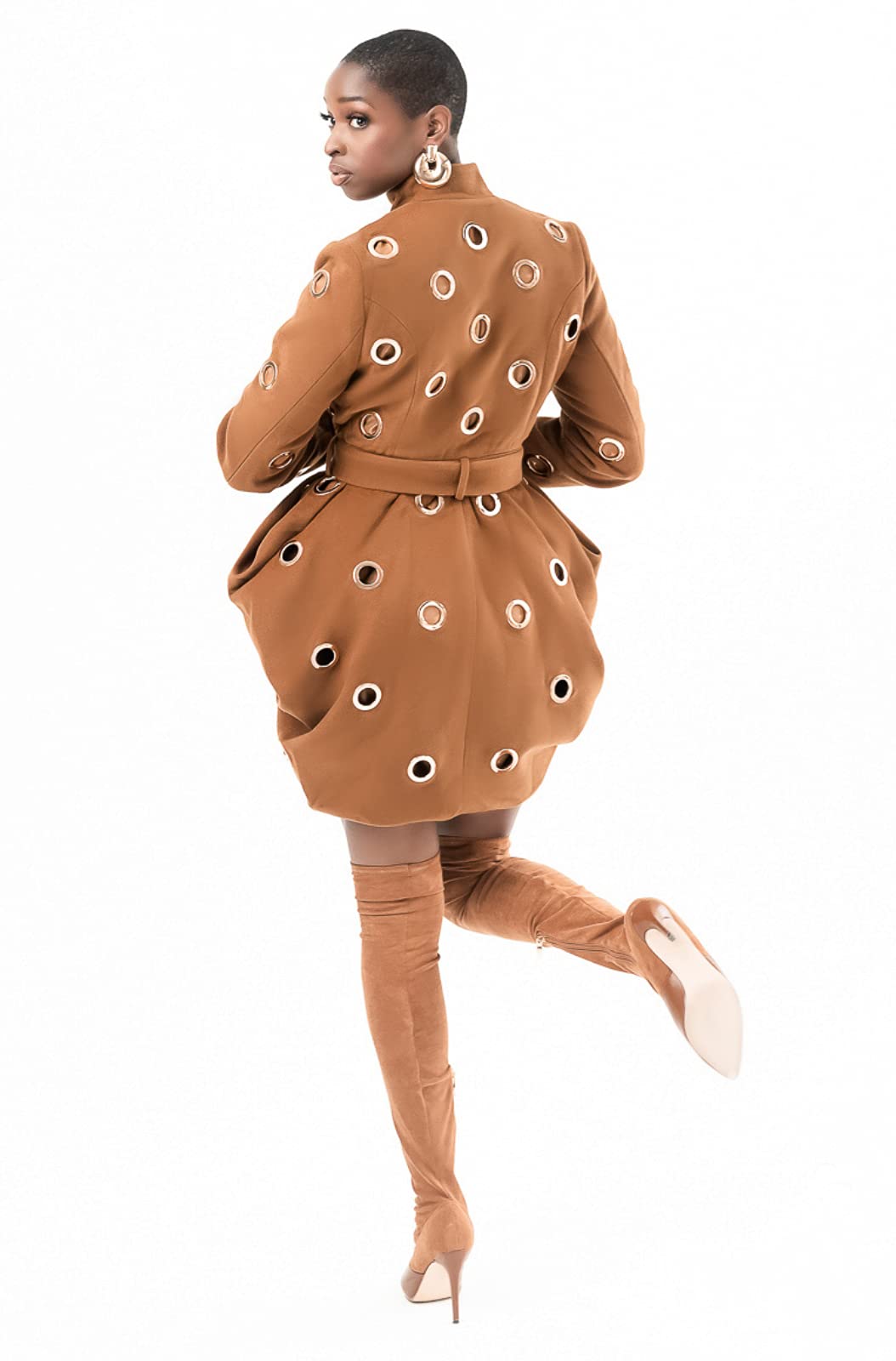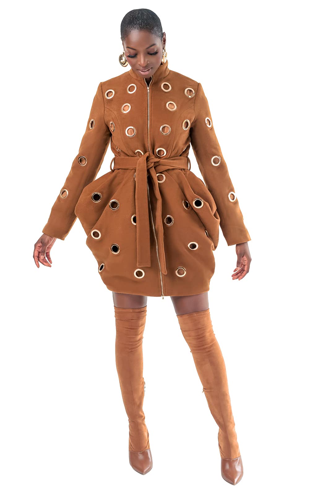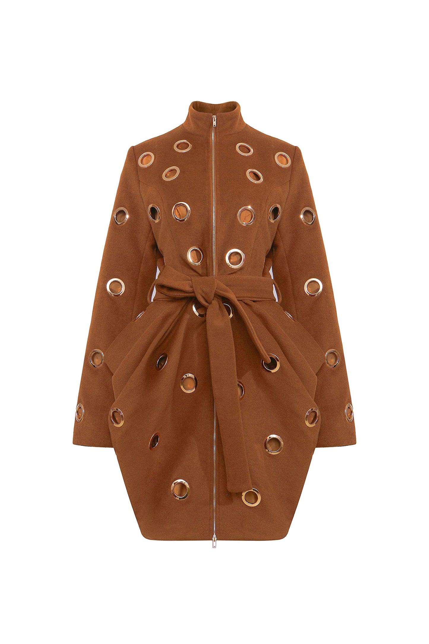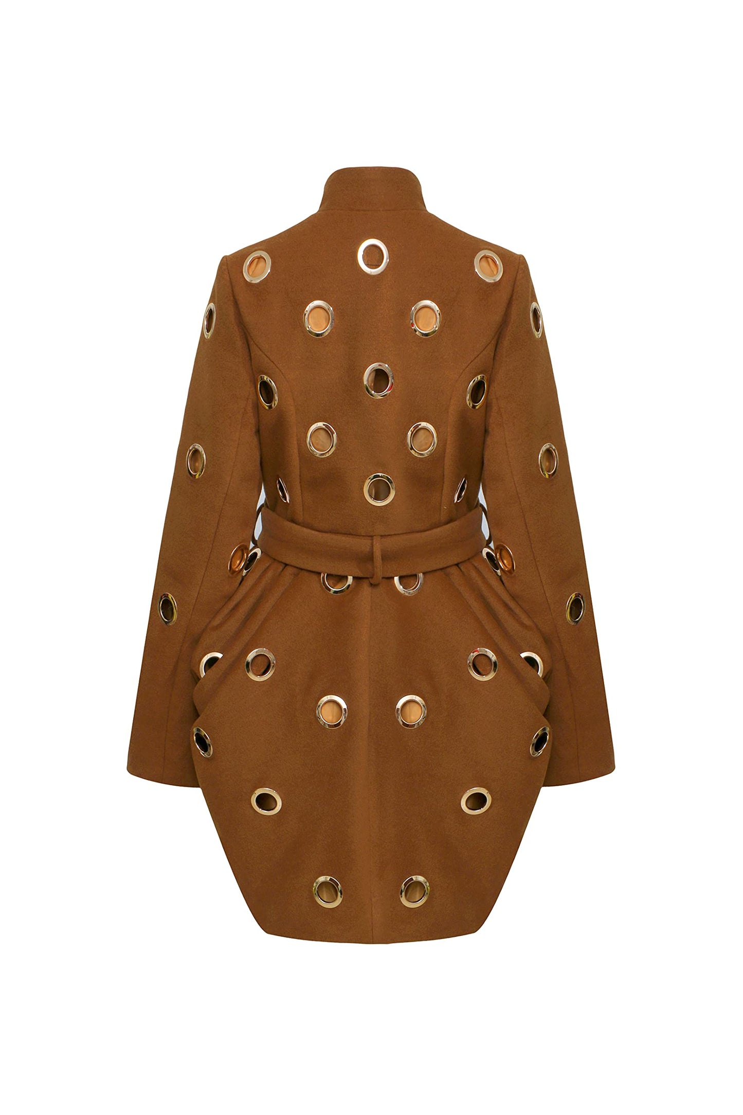 The Ronda convertible coat features our signature draping and is embellished with all over grommets. Skirt portion of the coat can be separated from the jacket creating a 3 in 1 look. Skirt removal reveals a cropped jacket and cape styled shawl.