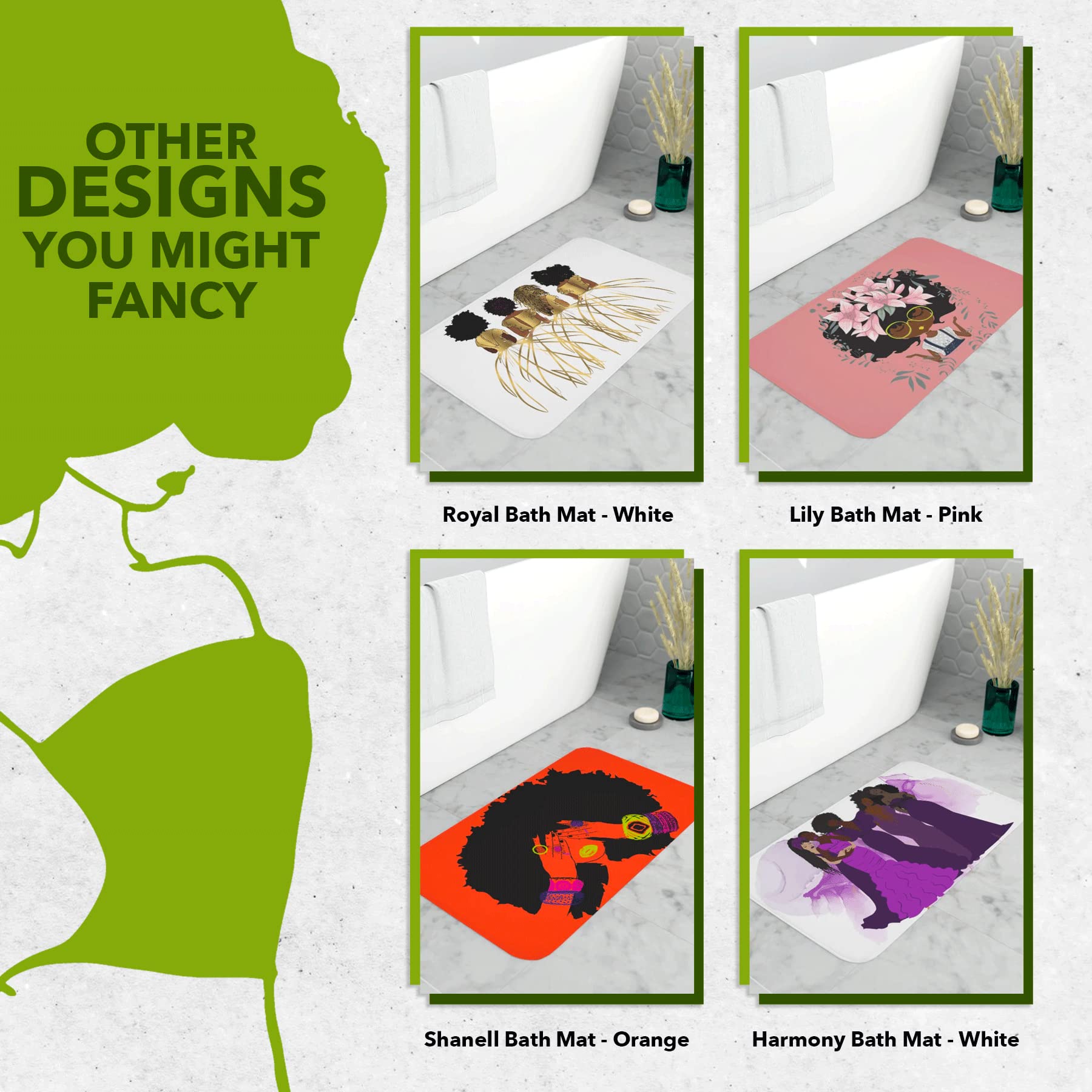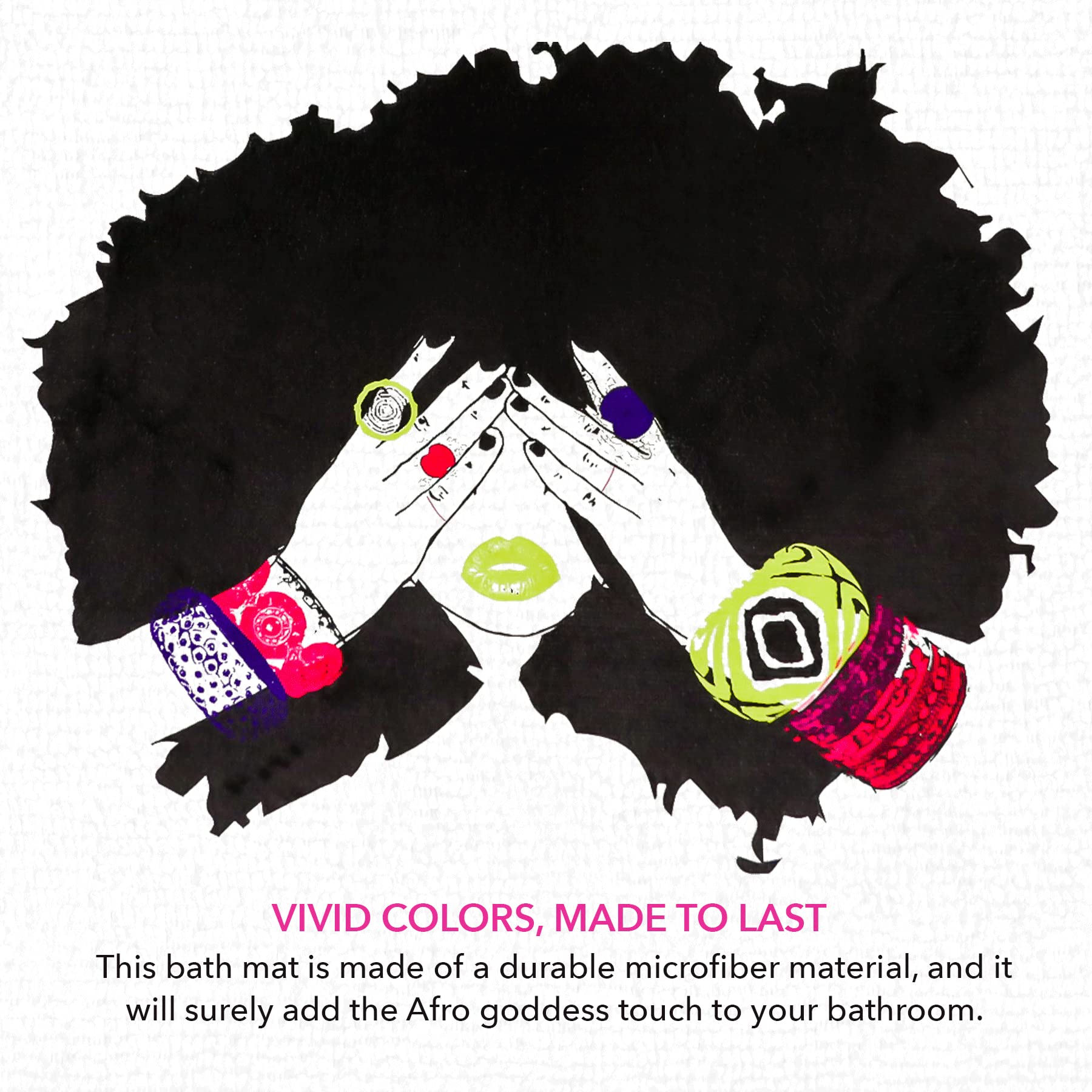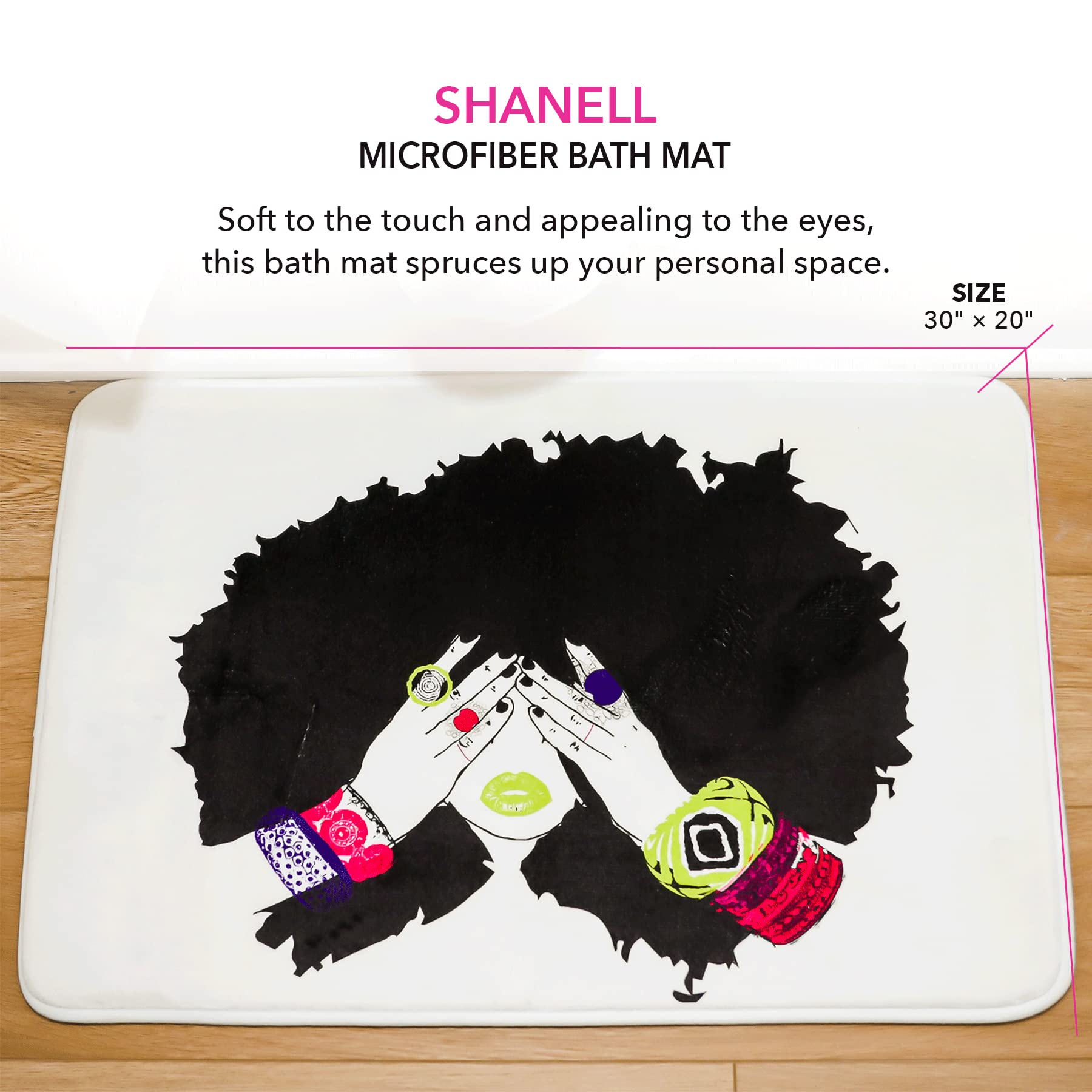 - CUSTOMIZATION FOR YOUR PERSONAL SPACE: Shanell Bath Mat is printed with a big Afro cutie wearing colorful accessories. These bath mats with flannel fleece construction can add a personal touch to your personal space. It is a white bath mat with a printed design that celebrates women proud of both their hair and their heritage.
