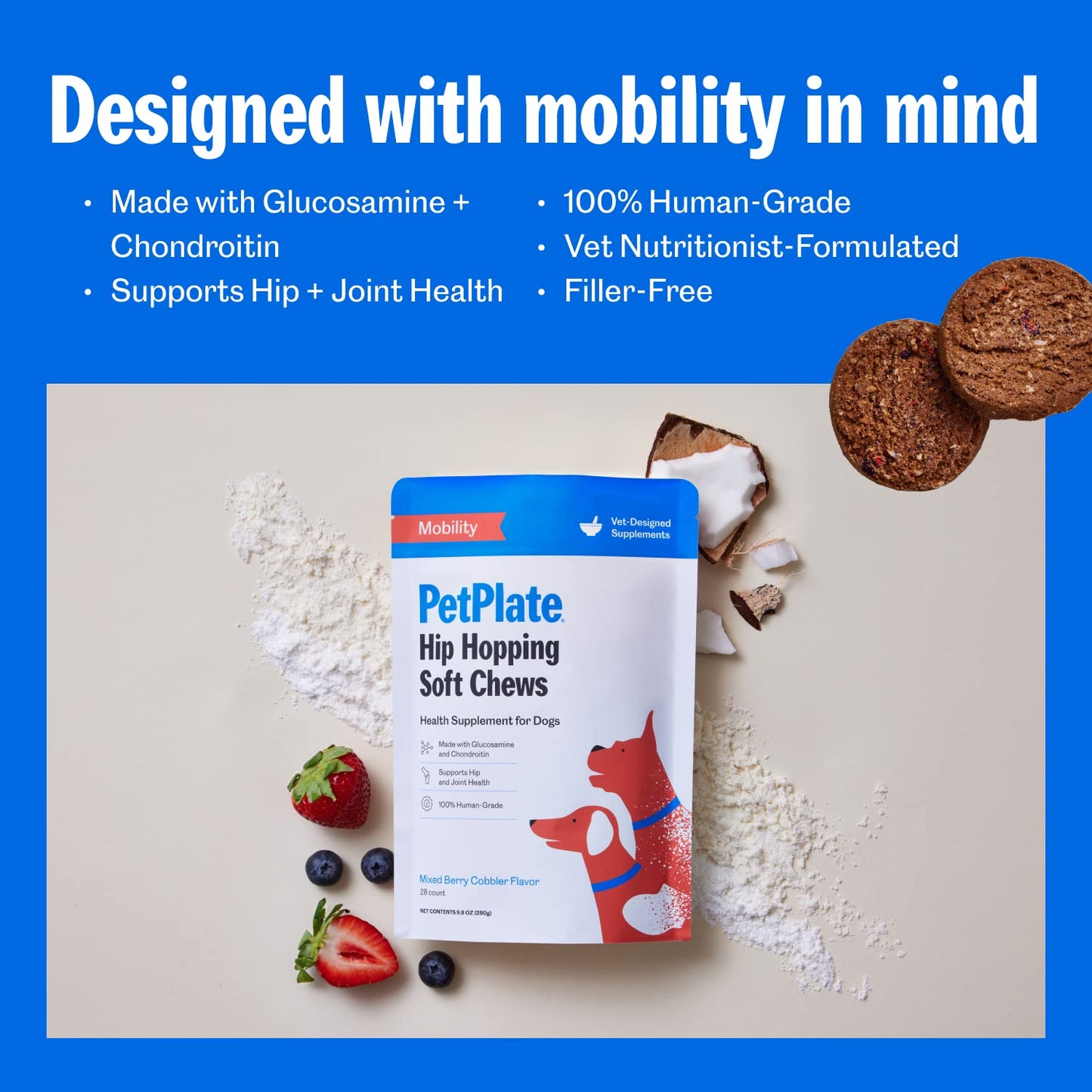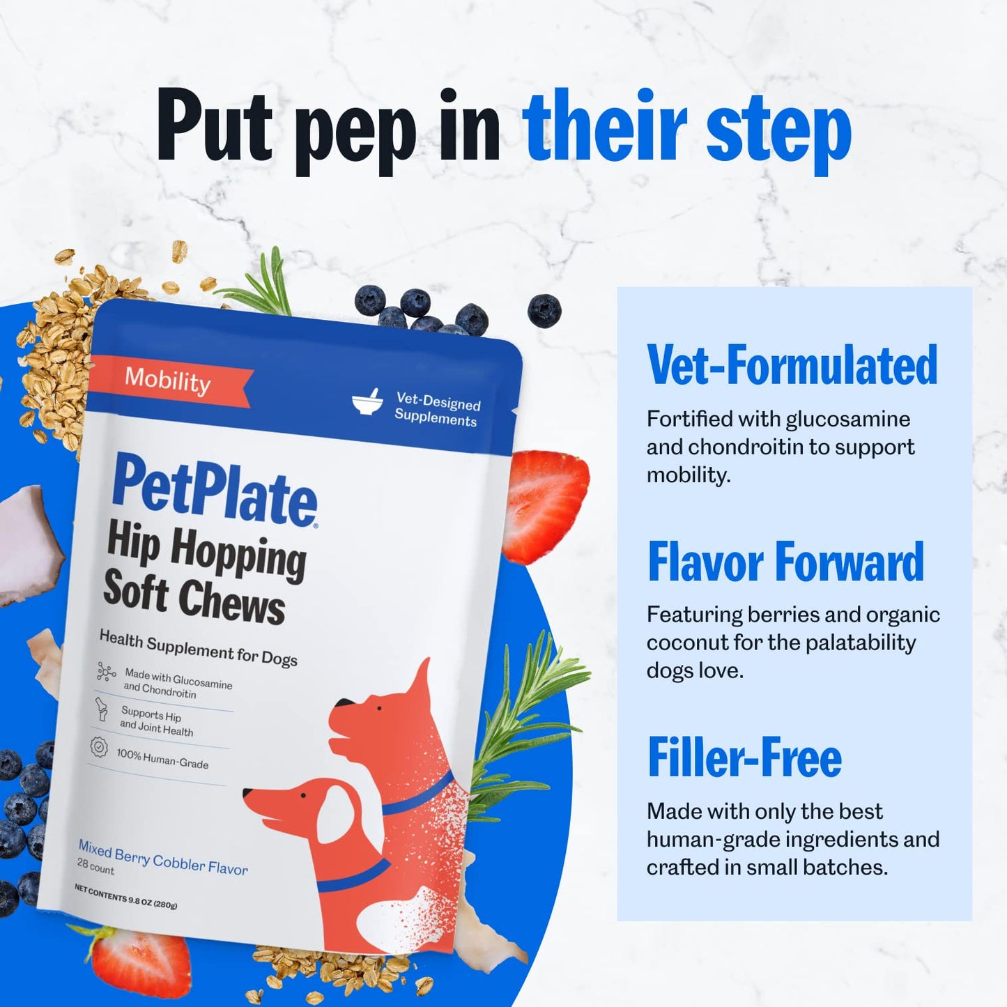 - MOBILITY SUPPORT SUPPLEMENTS: Our Hip Hopping Hip and Joint Support soft chews are made with glucosamine and chondroitin to support your dog's mobility.