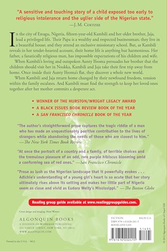 Fifteen-year-old Kambili and her older brother Jaja lead a privileged life in Enugu, Nigeria. They live in a beautiful house, with a caring family, and attend an exclusive missionary school. They're completely shielded from the troubles of the world. Yet, as Kambili reveals in her tender-voiced account, things are less perfect than they appear. Although her Papa is generous and well respected, he is fanatically religious and tyrannical at home—a home that is silent and suffocating.